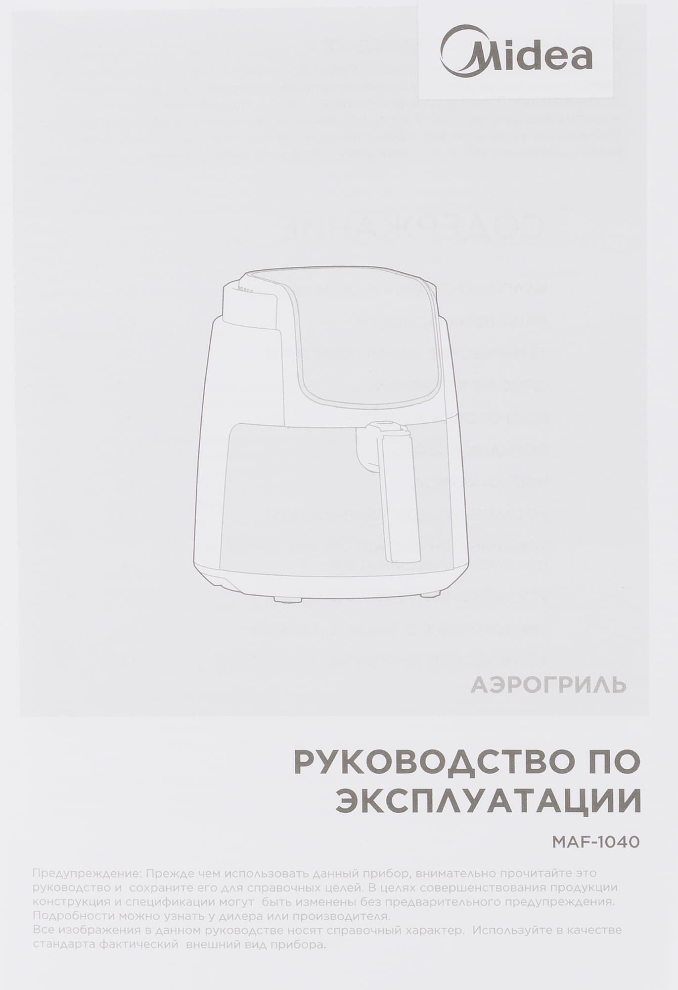 Внутри коробки мы обнаружили сам аэрогриль, а также несколько фирменных книжечек (гарантия, инструкция, рецепты, акции от производителя).