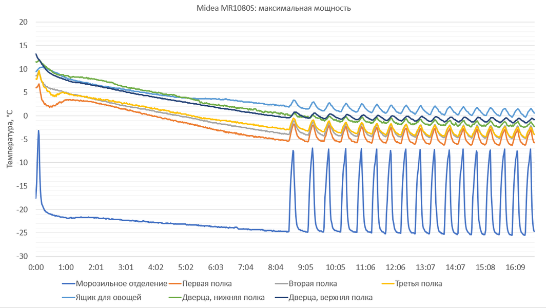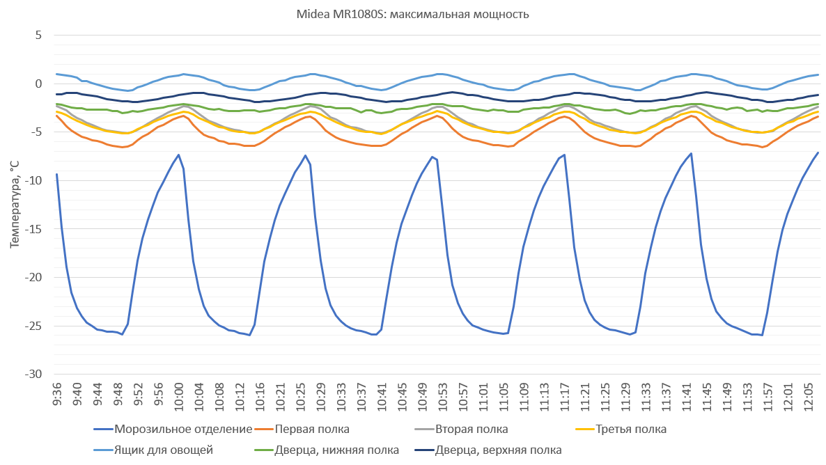 На графике можно видеть, что во всех точках измерения температура колеблется с периодом около 25 минут в весьма широких пределах, понижаясь при включении компрессора и плавно повышаясь после его отключения. Колебания заметны даже в ящике для овощей, но сильнее всего они в низкотемпературной зоне: при минимуме в −25,9 °C и максимуме в −7,1 °C амплитуда равна почти 19 градусам Цельсия.