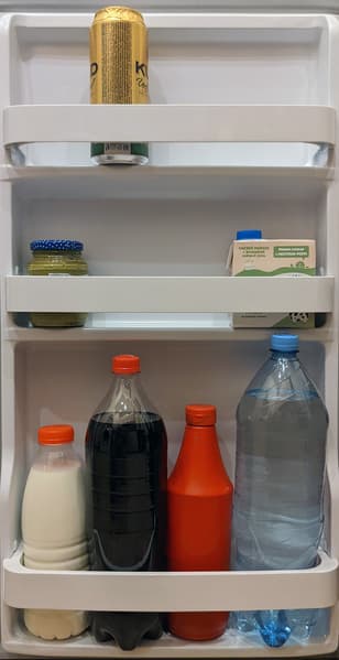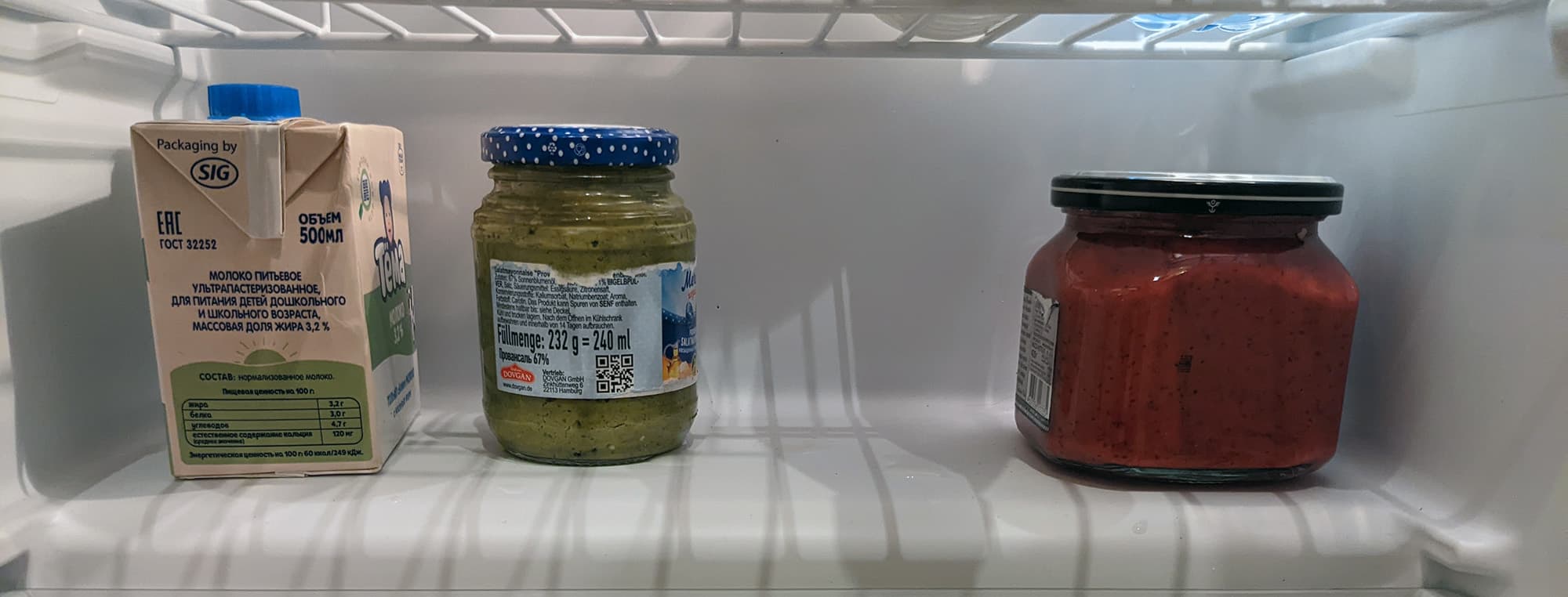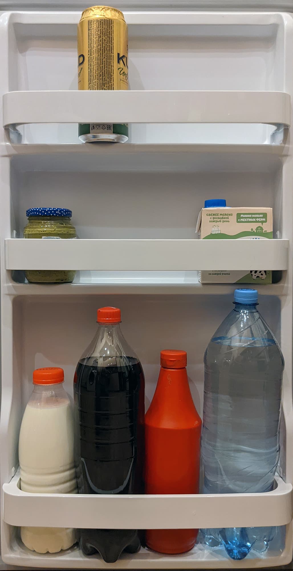 На средней полке дверцы удобно хранить небольшие банки и бутылки, а также тетрапаки объемом до 500 мл. Пол-литровая алюминиевая банка, поставленная на верхнюю полку, упирается в край дверцы и устанавливается с небольшим перекосом, но это не препятствует закрытию.