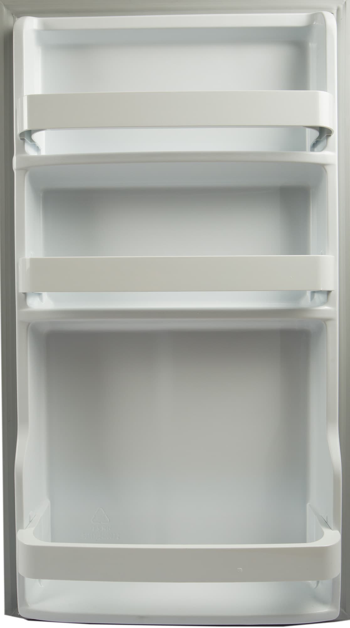 Три полки на дверце жестко встроены в корпус и не допускают регулировок. Их глубина невелика: поставить полуторалитровую бутылку еще можно, а вот контейнер для полудюжины яиц, прилагающийся к холодильнику, сюда не поместится.
