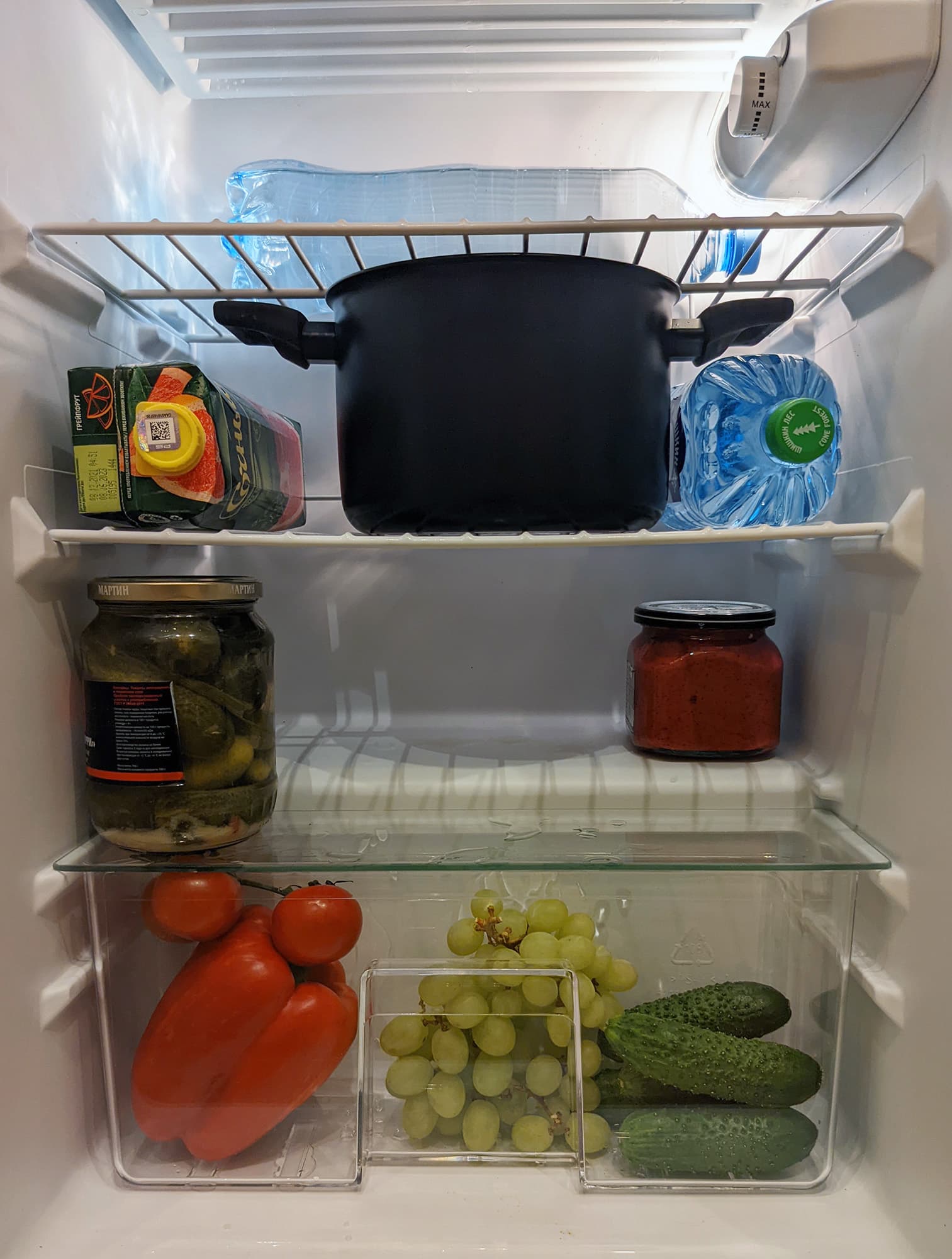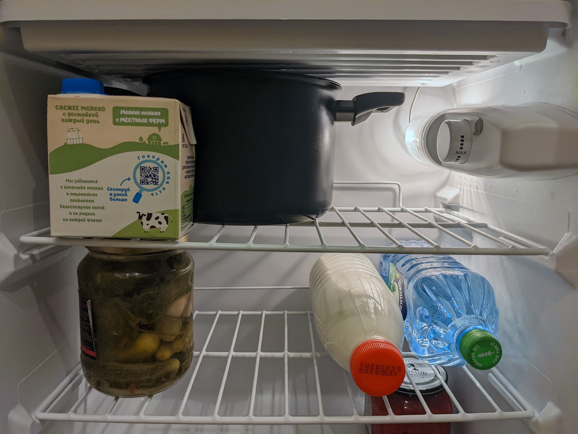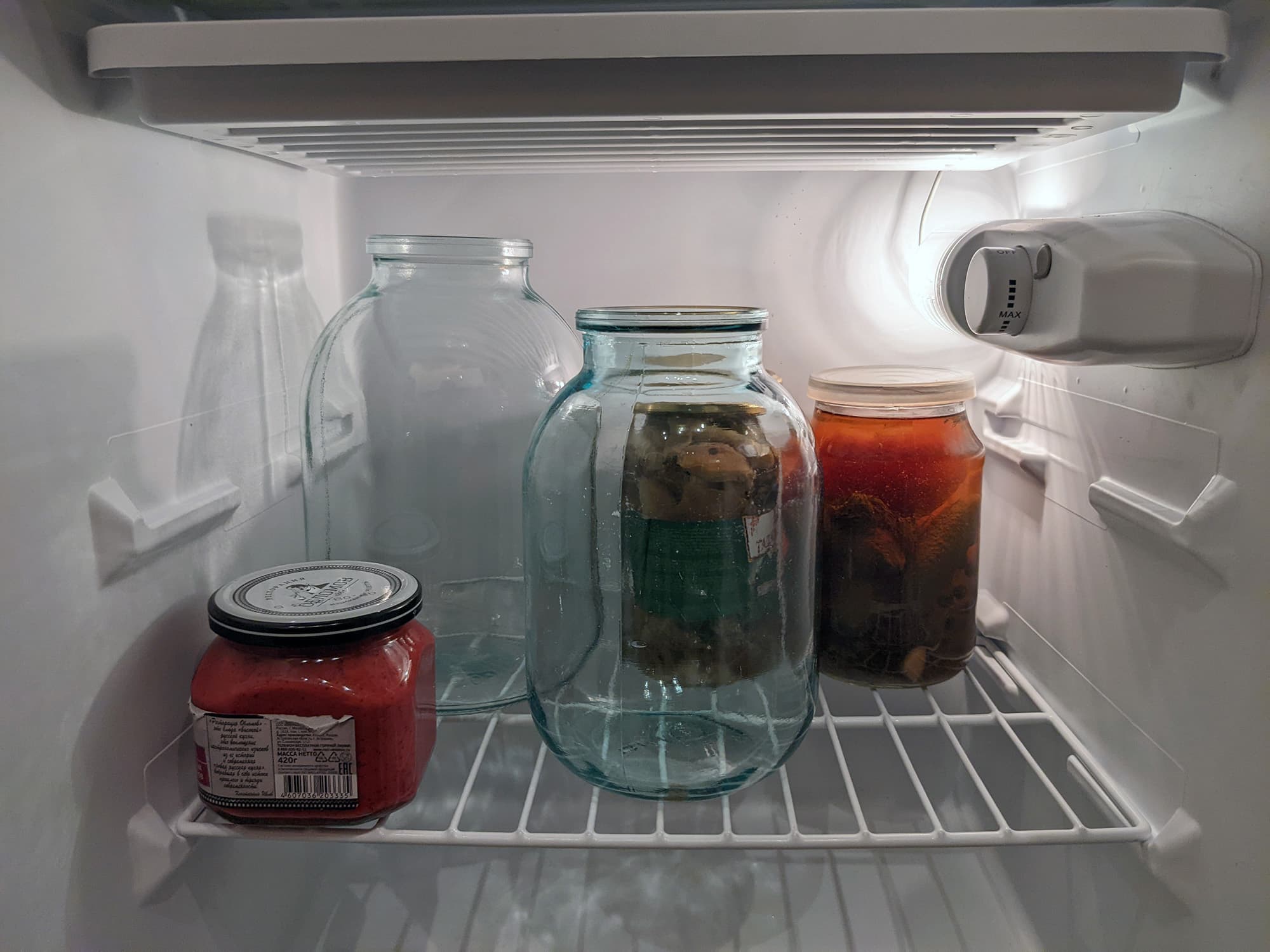 Глубина холодильного отделения позволяет разместить на полках литровый пакет с соком или 1,5-литровую бутылку с водой. На первую и вторую полки вмещается трехлитровая кастрюля из Ikea. На любую полку без труда встает 700-граммовая стеклянная банка. Двухлитровая же бутыль помещается на полки только в поперечном положении.