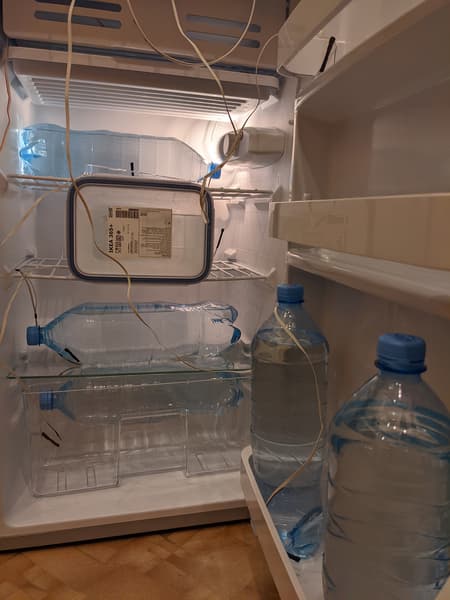 Чтобы имитировать работу загруженного холодильника, в процессе тестирования холодильной камеры мы использовали водяной балласт в четырехлитровых контейнерах. Кроме того, на полки и дверцу положили несколько пластиковых бутылок с водой.