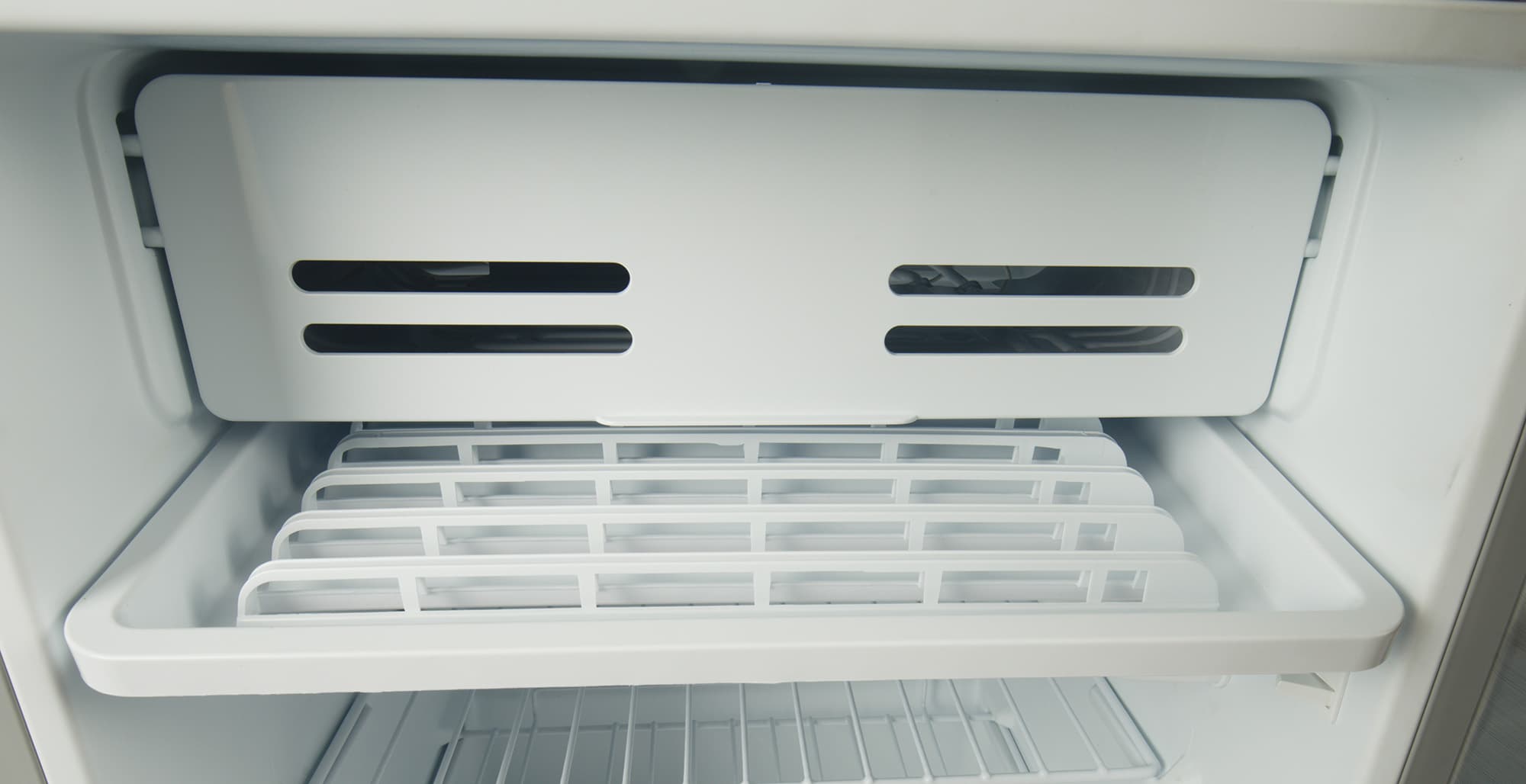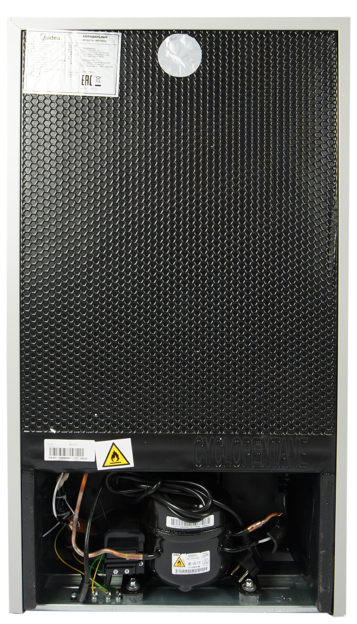 Металлическая полка камеры быстрого охлаждения представляет собой плоский теплообменник: трубки с хладагентом проходят внутри конструкции. Под ней расположен выдвижной пластиковый поддон для сбора конденсата. Система размораживания у Midea MR1080S традиционная, капельная.