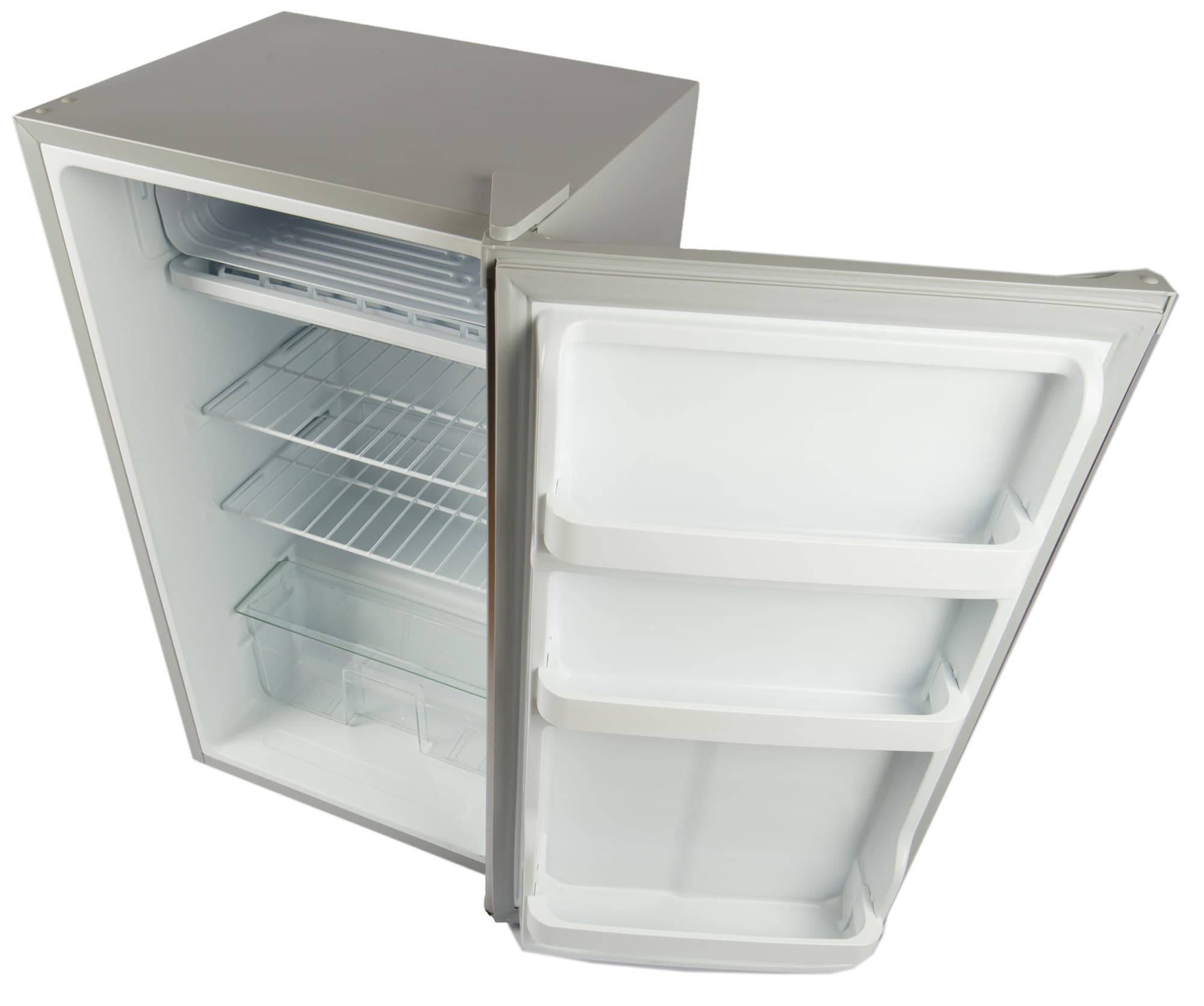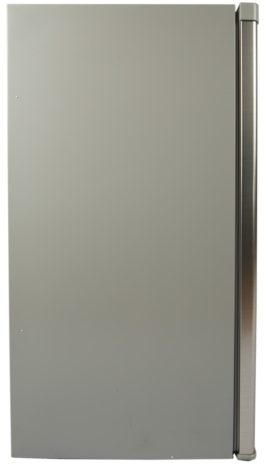 Металлический корпус холодильника выполнен в серо-стальной гамме. Пластиковые детали, обрамляющие дверцу, тоже серые, в тон.