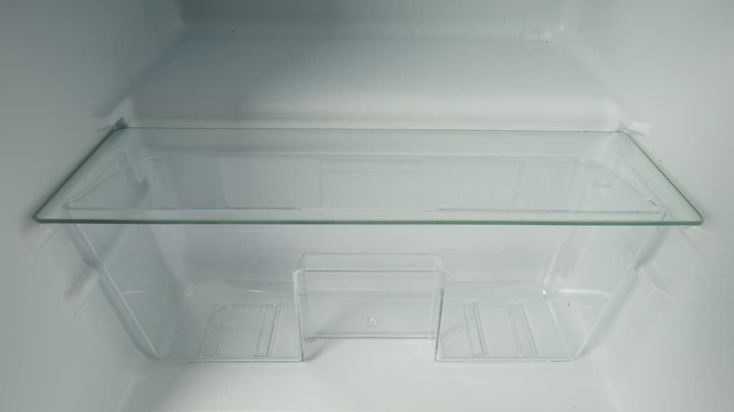 Прозрачный пластиковый ящик для овощей закрыт стеклянной крышкой, которая одновременно служит нижней полкой. Пластиковых обрамлений у крышки нет.