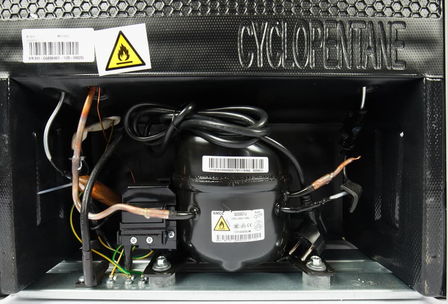 Агрегат заполнен хладагентом R600A и установлен на четырех амортизирующих шайбах из толстой черной резины, призванных гасить вибрацию работающего компрессора и уменьшать уровень шума.