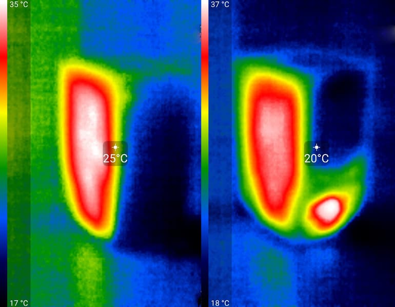 Решетки теплообменника у Midea MR1080S скрыты за боковыми стенками. Они заметно нагреваются при работе — это особенно хорошо видно на фотографиях, сделанных с помощью тепловизора.