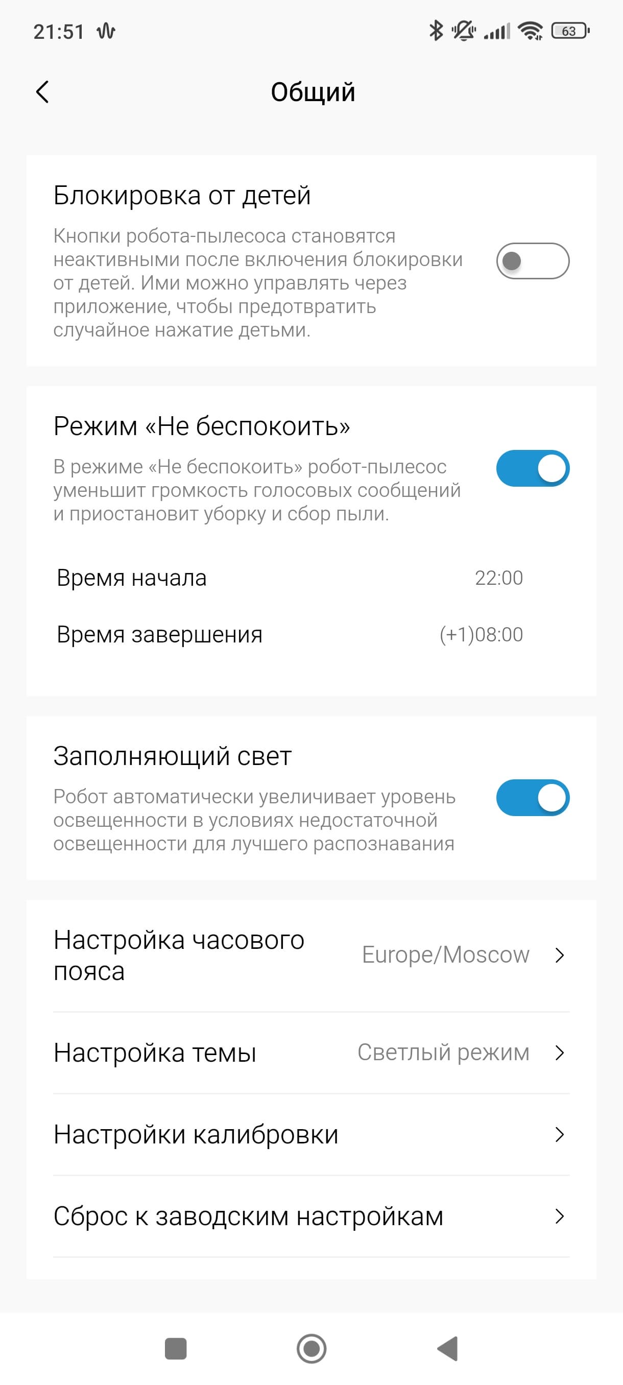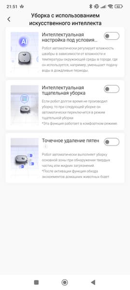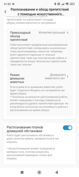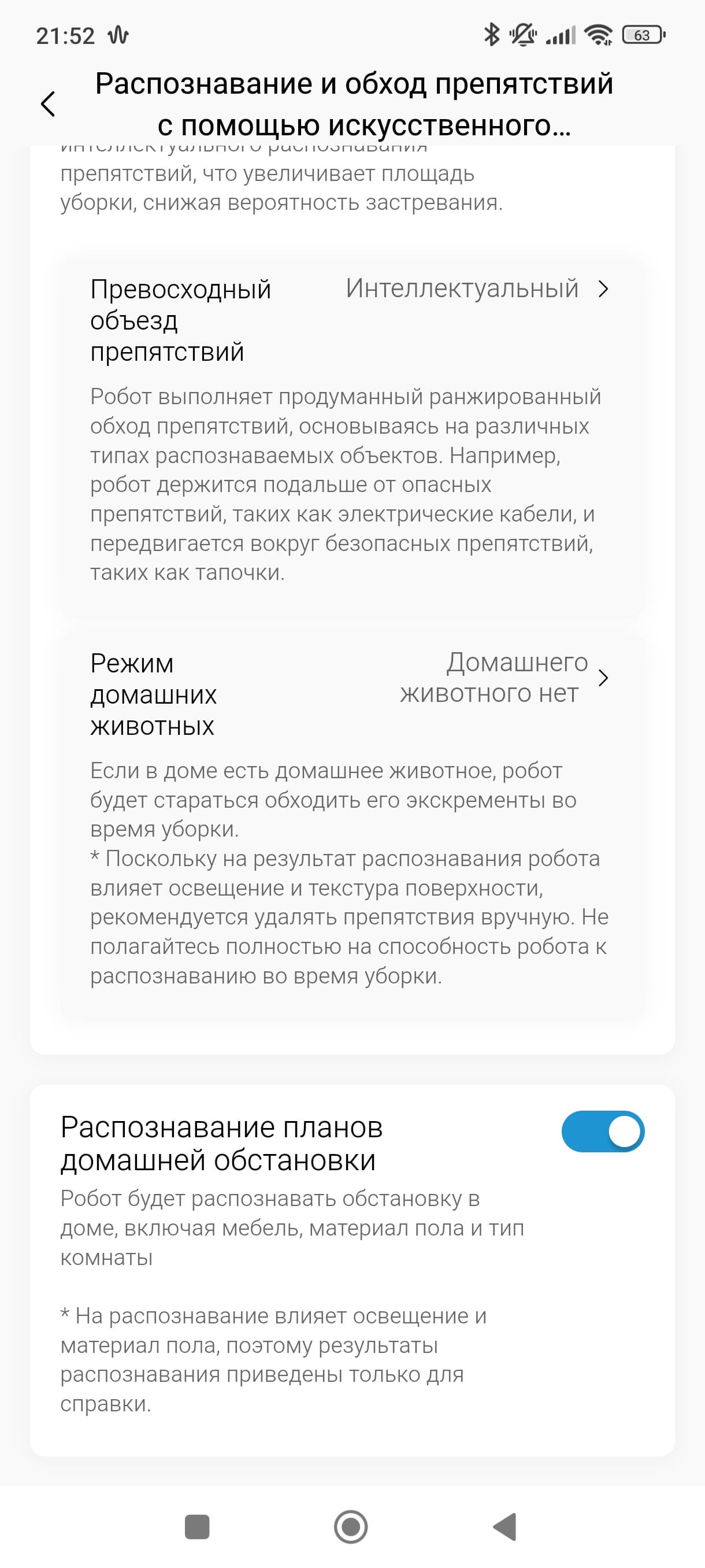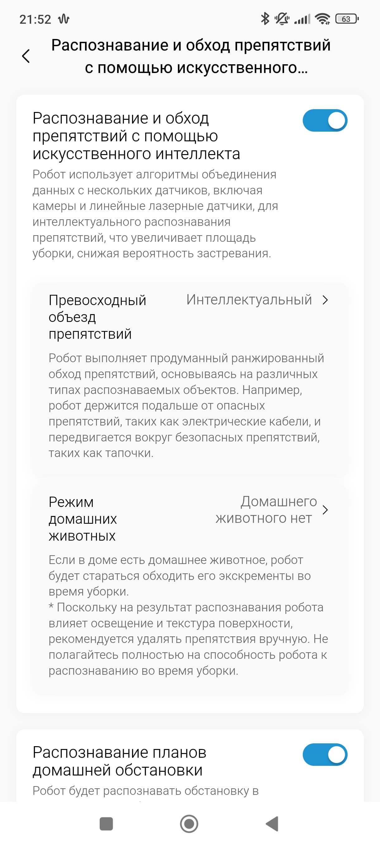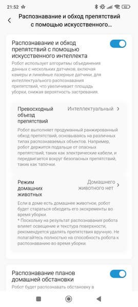 Среди прочих возможностей — уборка по расписанию, просмотр истории уборок, более глубокие настройки уборки с предпочтениями по навигации, возможность выбора голосового пакета, просмотр срока службы расходников, блокировка от детей и режим «не беспокоить», уборка с использованием искусственного интеллекта (с правилами для распознавания различных препятствий)... в общем, настроек тут много, и в них явно стоит покопаться для того, чтобы настроить параметры так, чтобы они наилучшим образом подходили для данного конкретного помещения. Например, роботу можно сообщить, есть ли в квартире домашние животные, и он подстроит свое поведение в соответствии с полученной информацией — будет более настороженно относиться к загрязнениям, похожим на экскременты, а также постарается не слишком «доставать» отдыхающего пушистика.