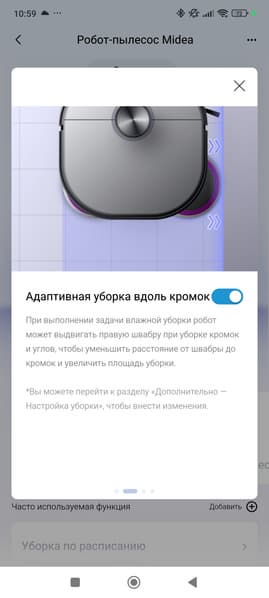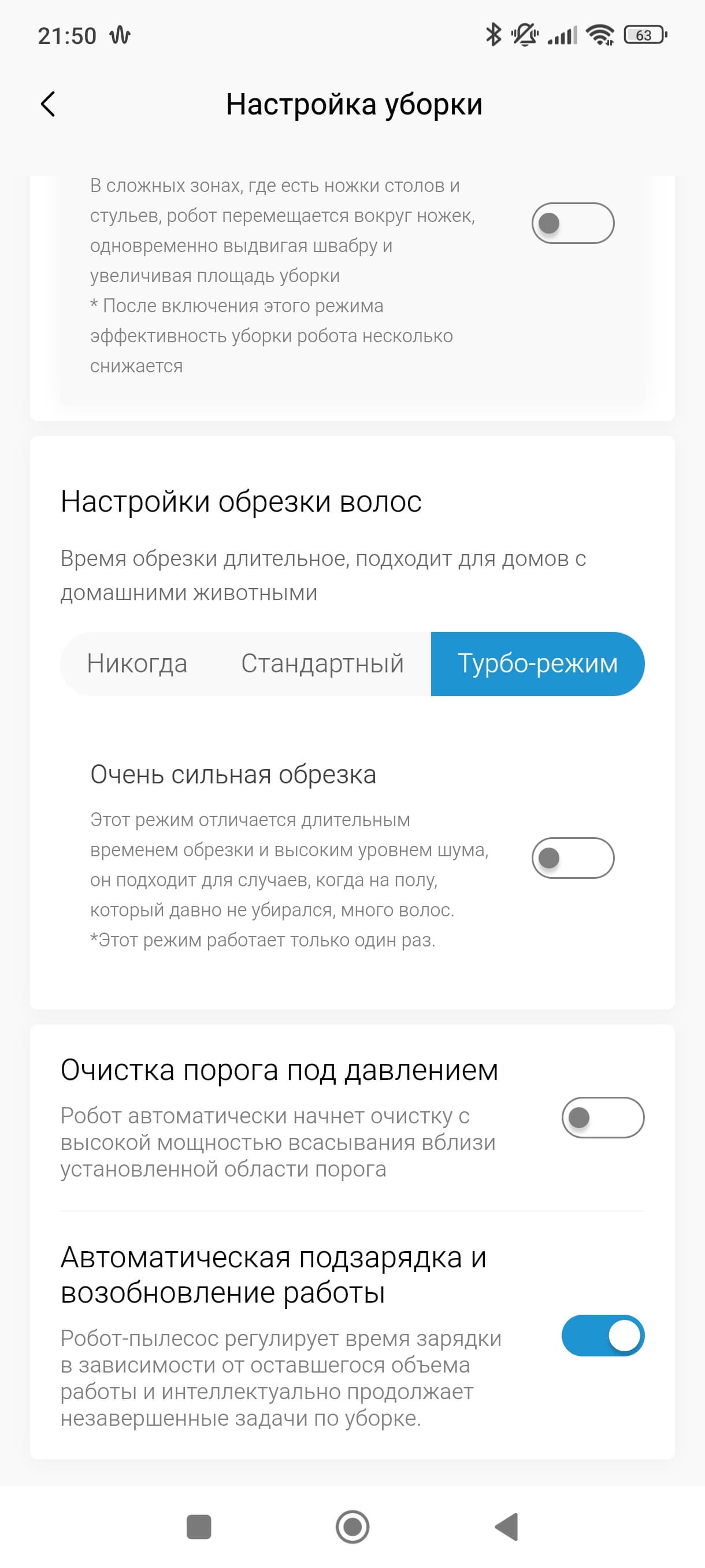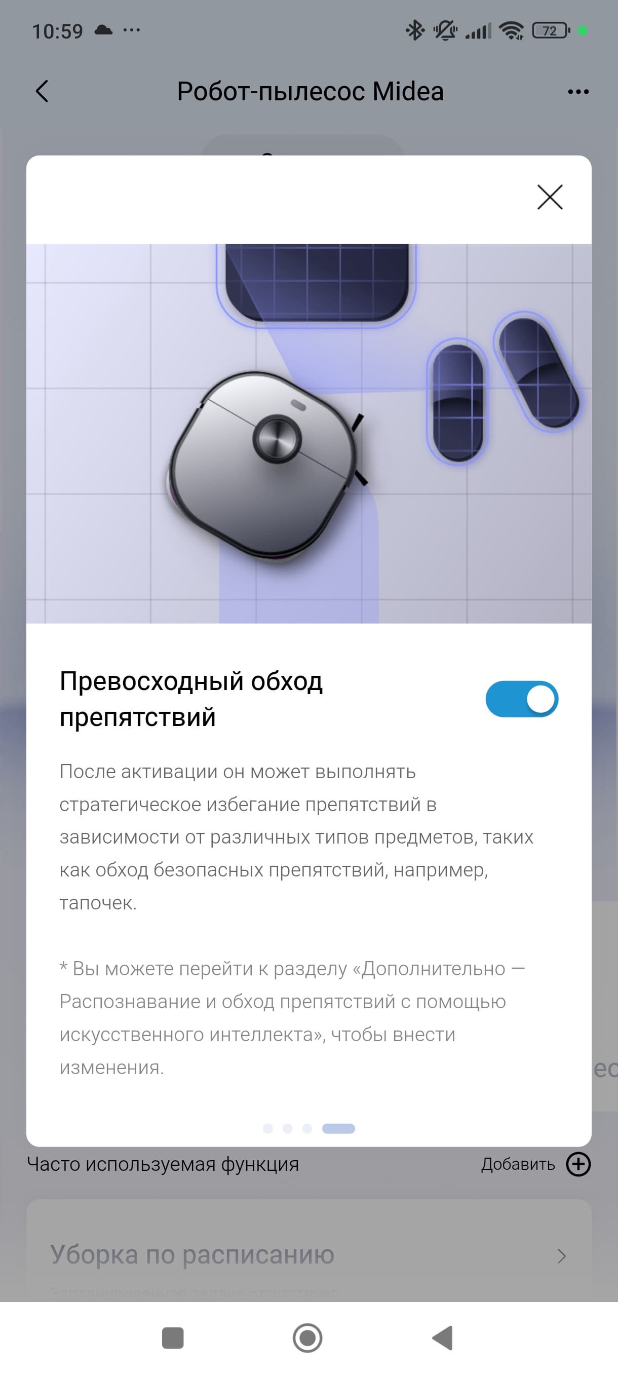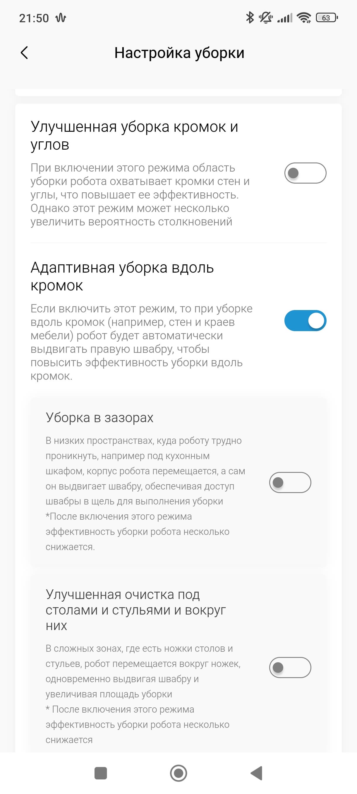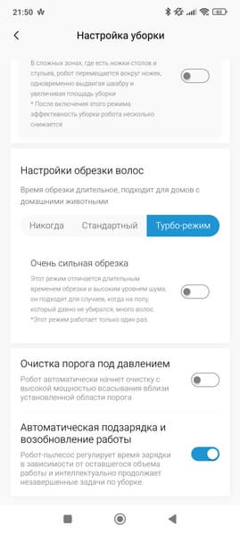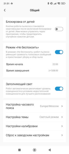 Среди прочих возможностей — уборка по расписанию, просмотр истории уборок, более глубокие настройки уборки с предпочтениями по навигации, возможность выбора голосового пакета, просмотр срока службы расходников, блокировка от детей и режим «не беспокоить», уборка с использованием искусственного интеллекта (с правилами для распознавания различных препятствий)... в общем, настроек тут много, и в них явно стоит покопаться для того, чтобы настроить параметры так, чтобы они наилучшим образом подходили для данного конкретного помещения. Например, роботу можно сообщить, есть ли в квартире домашние животные, и он подстроит свое поведение в соответствии с полученной информацией — будет более настороженно относиться к загрязнениям, похожим на экскременты, а также постарается не слишком «доставать» отдыхающего пушистика.