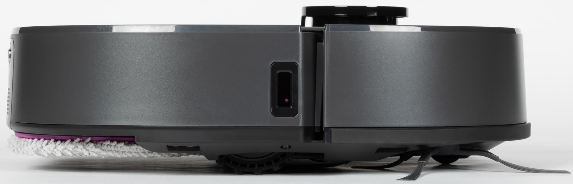 Производитель сообщает, что это неспроста — именно такой формат, по их мнению, позволяет добиться оптимального качества уборки в углах. Робот довольно крупный — весит без малого 5 килограмм, а его высота составляет 11 см. Корпус сделан из симпатичного пластика, окрашенного под графит. Отметим, что отпечатки пальцев, пыль и прочие загрязнения, увы, на корпусе будут видны очень хорошо.