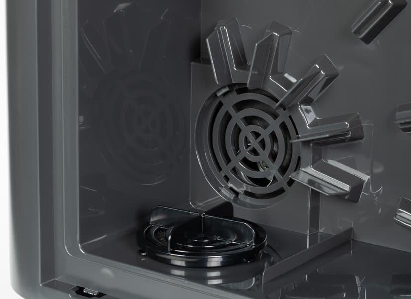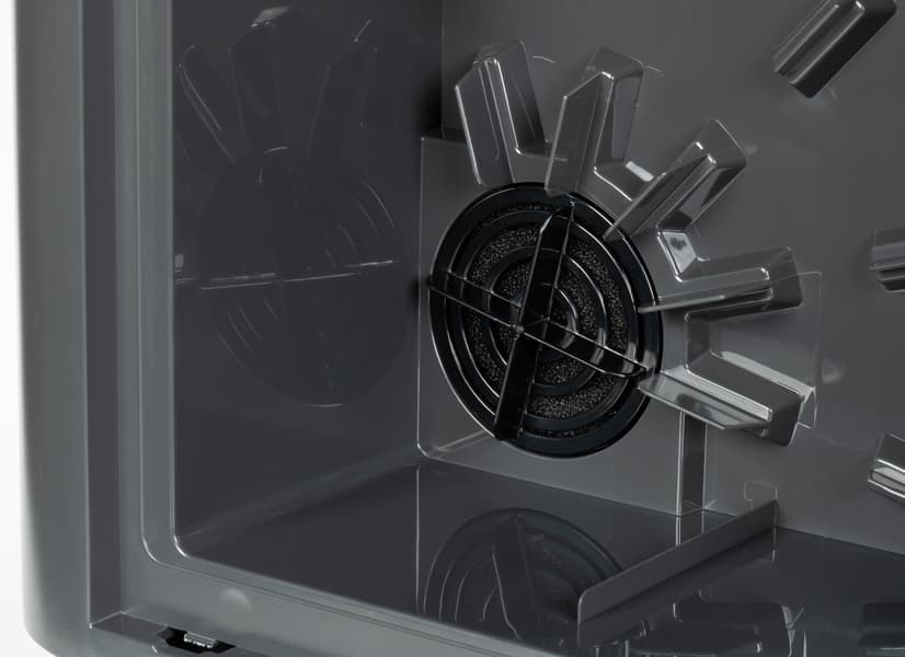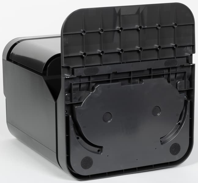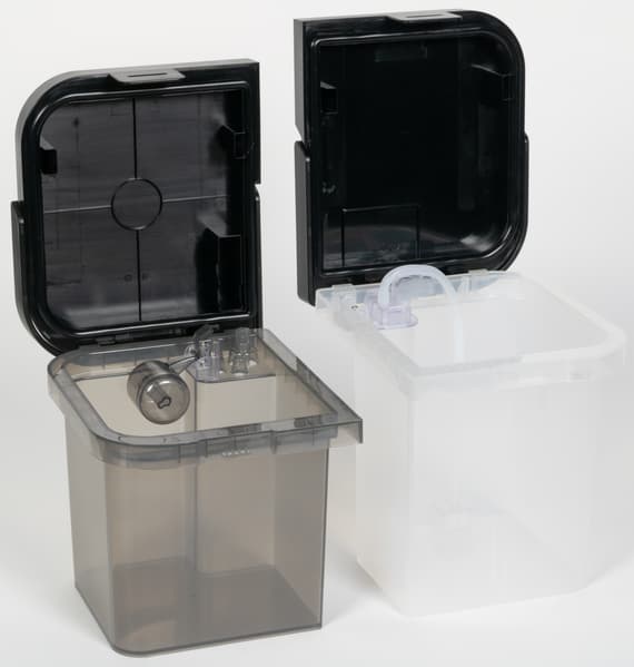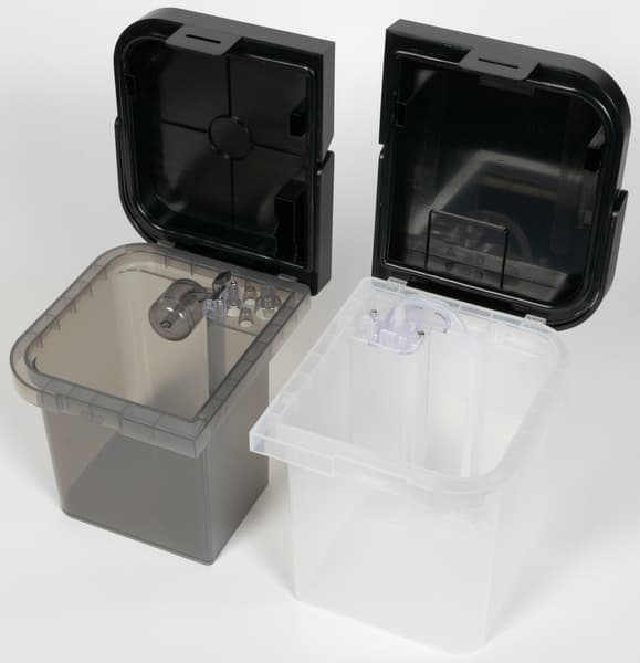 Контейнер сделан из полупрозрачного серого пластика, фиксирующийся внутри корпуса с помощью защелки.