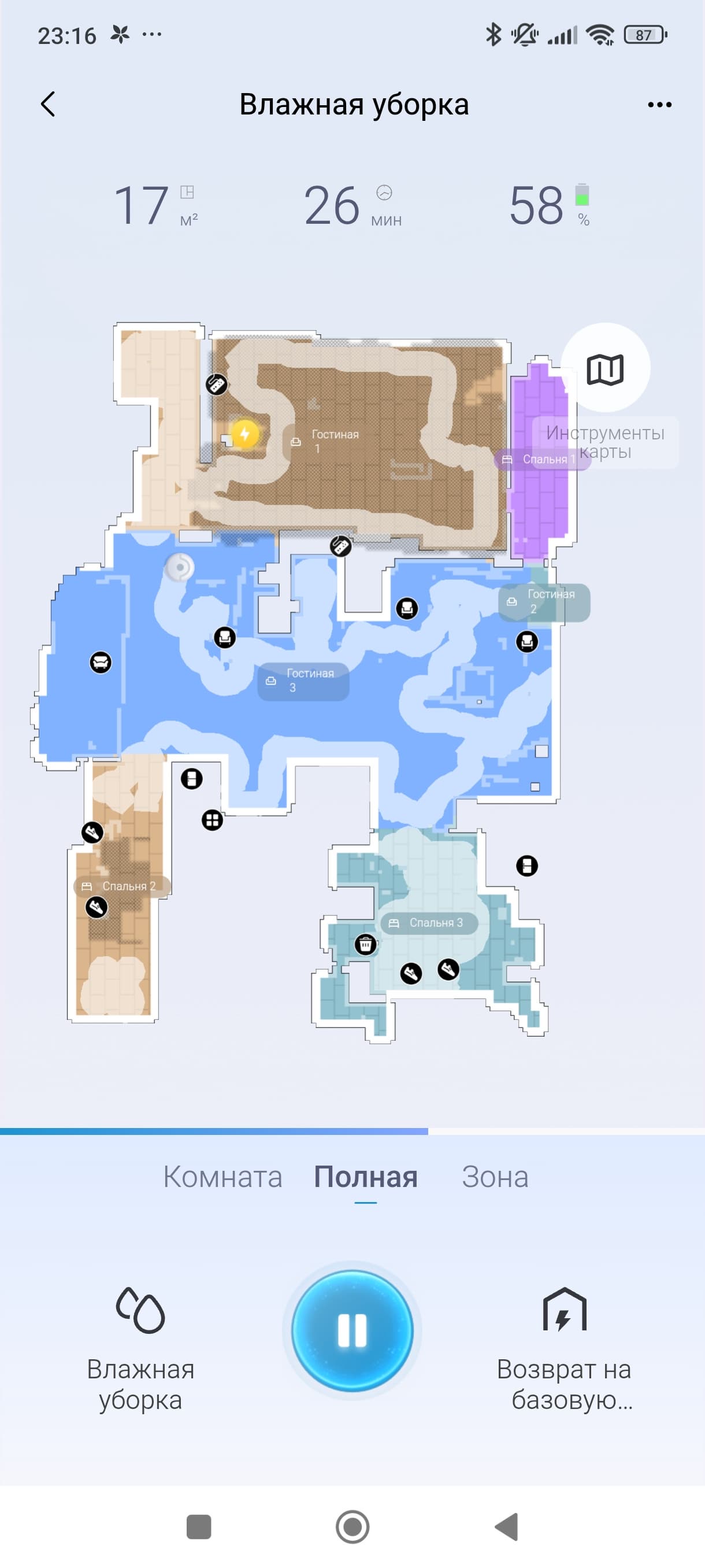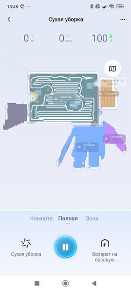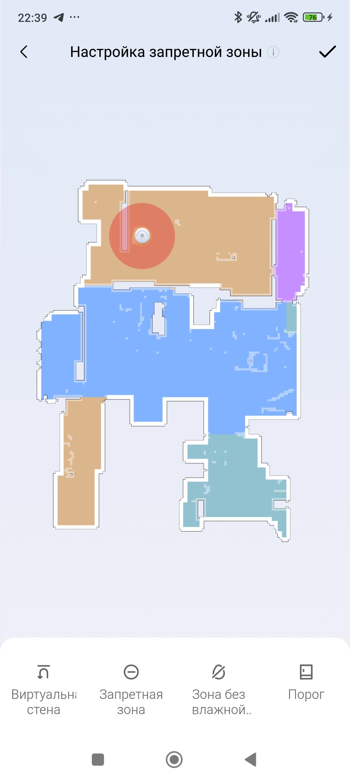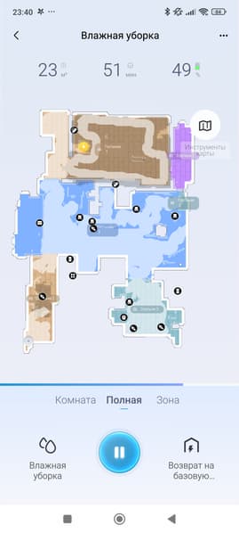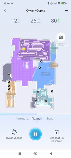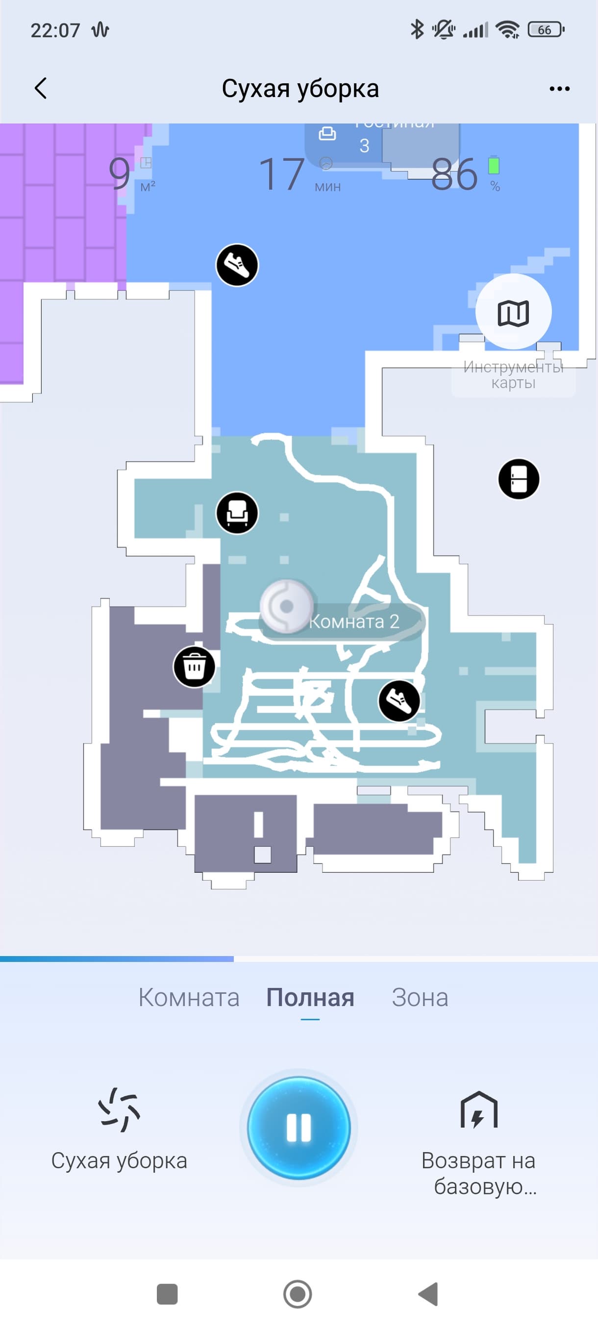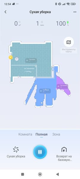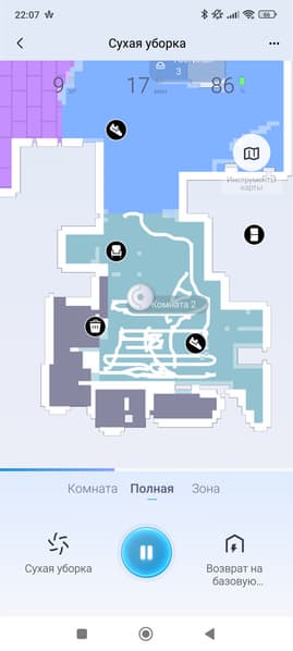 После завершения построения карты квартира будет автоматически размечена на комнаты. После этого пользователь может расставить виртуальные стены и запретные зоны (в том числе отдельно — указать зоны без влажной уборки).