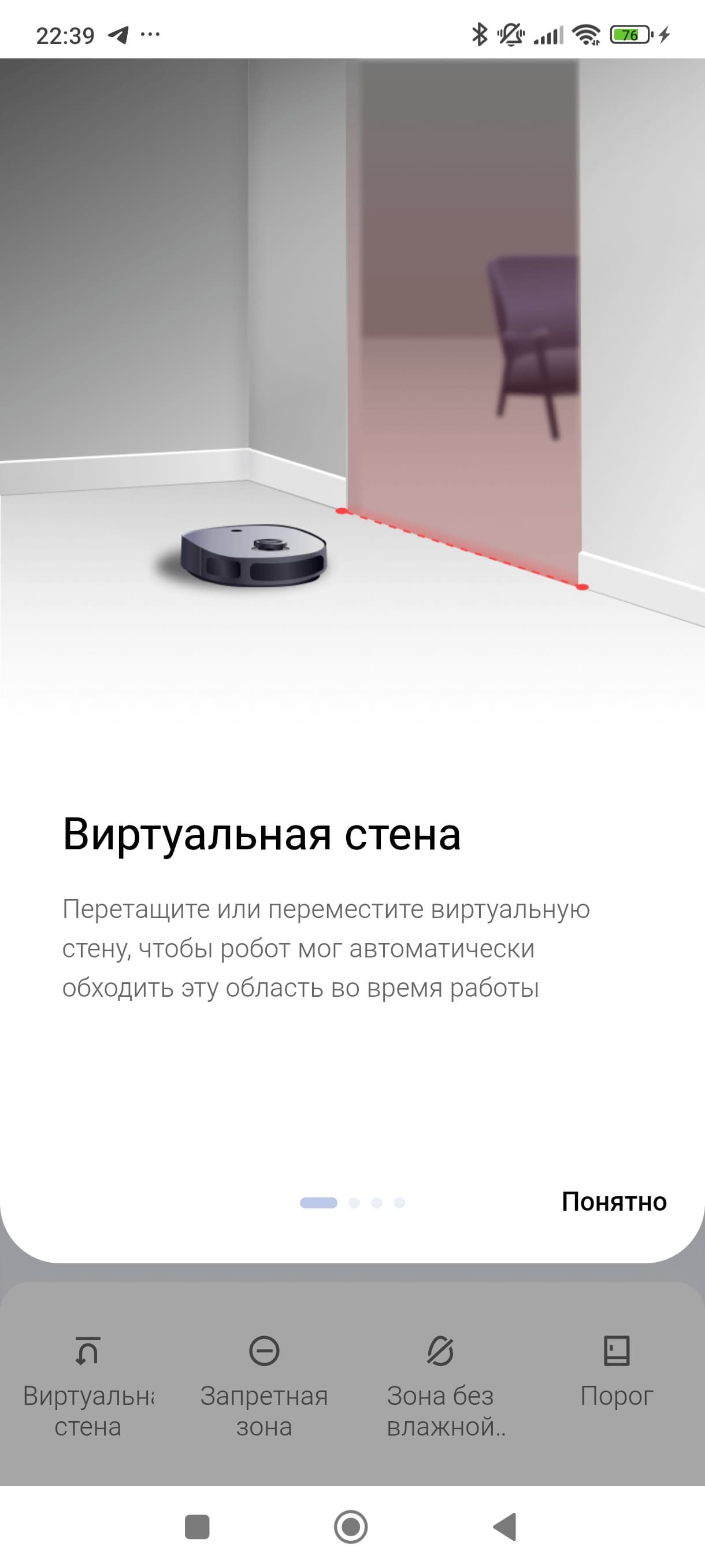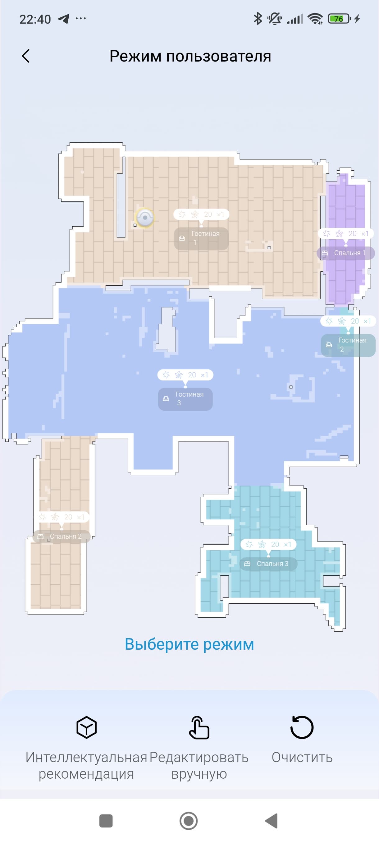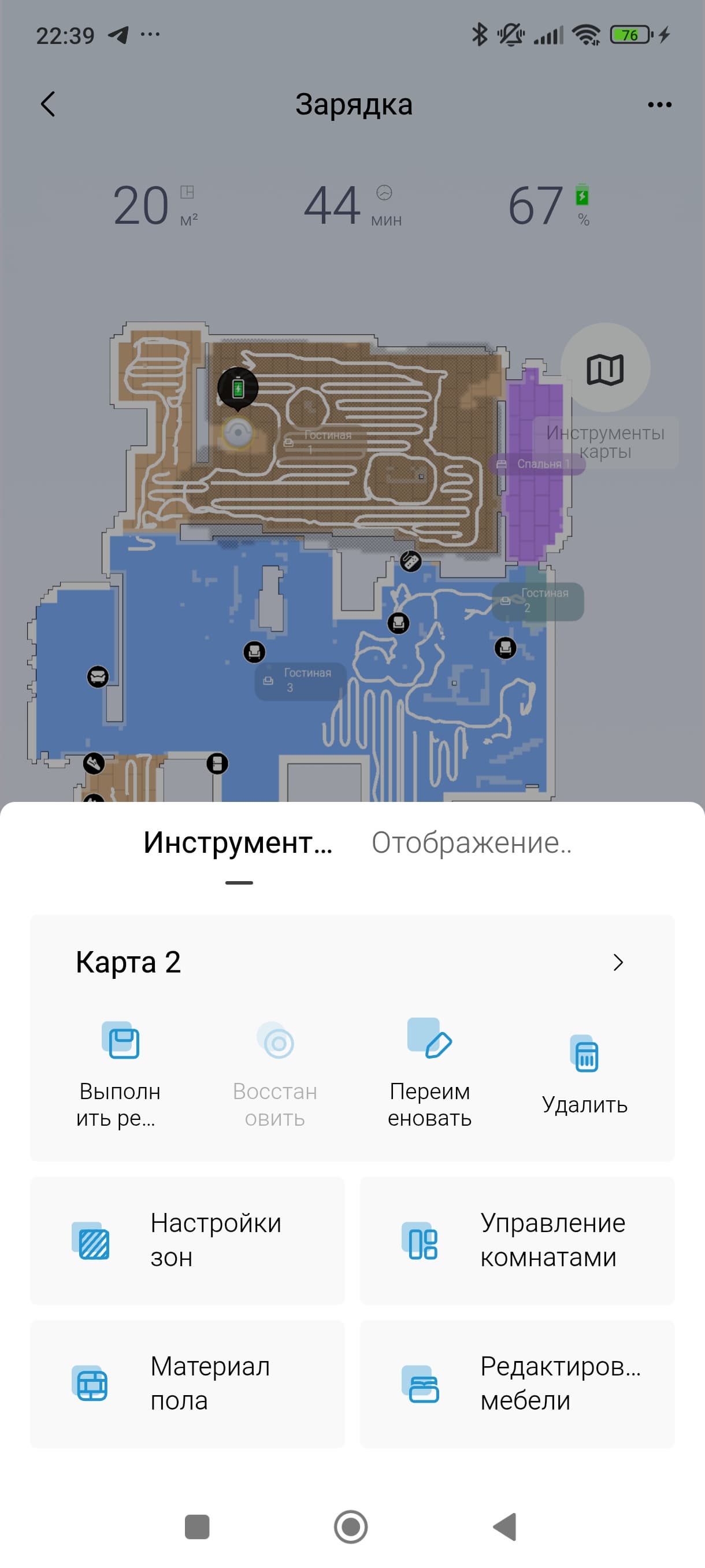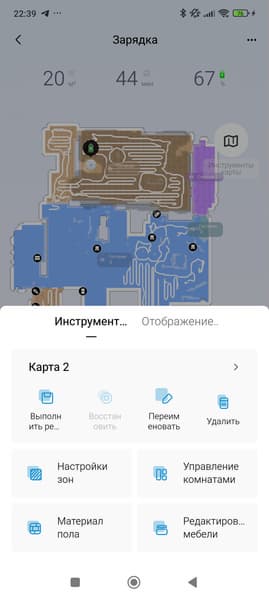 После завершения построения карты квартира будет автоматически размечена на комнаты. После этого пользователь может расставить виртуальные стены и запретные зоны (в том числе отдельно — указать зоны без влажной уборки).