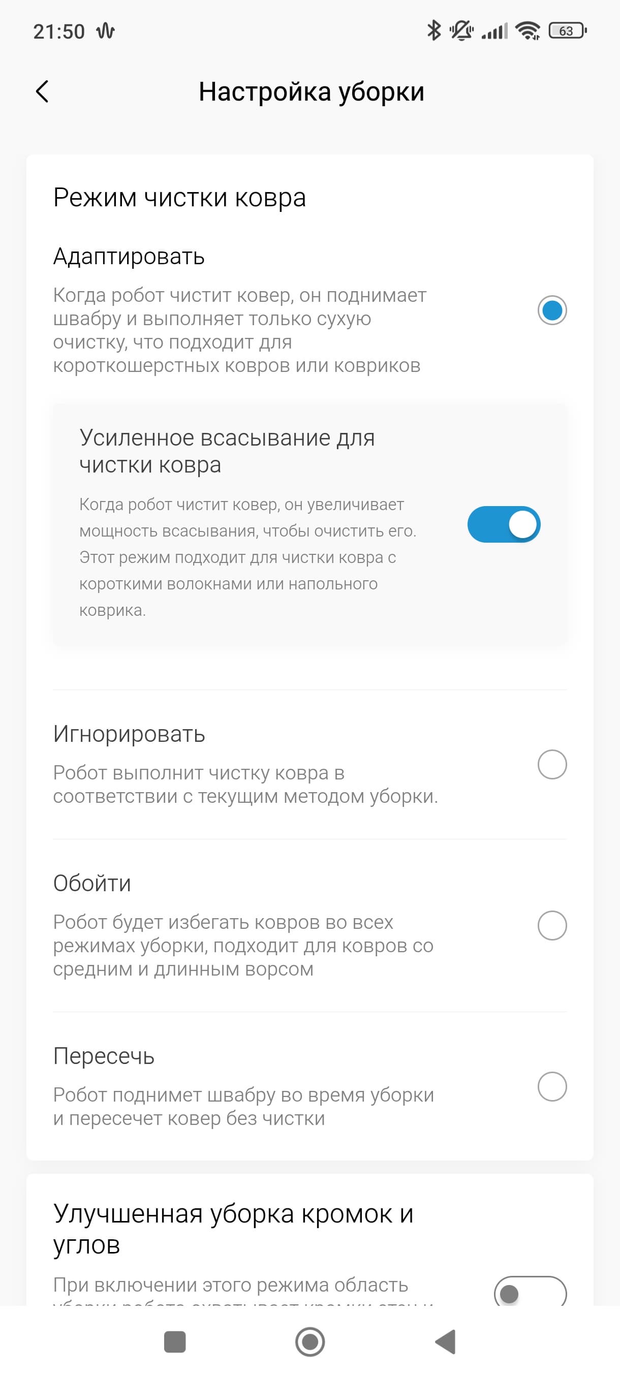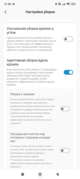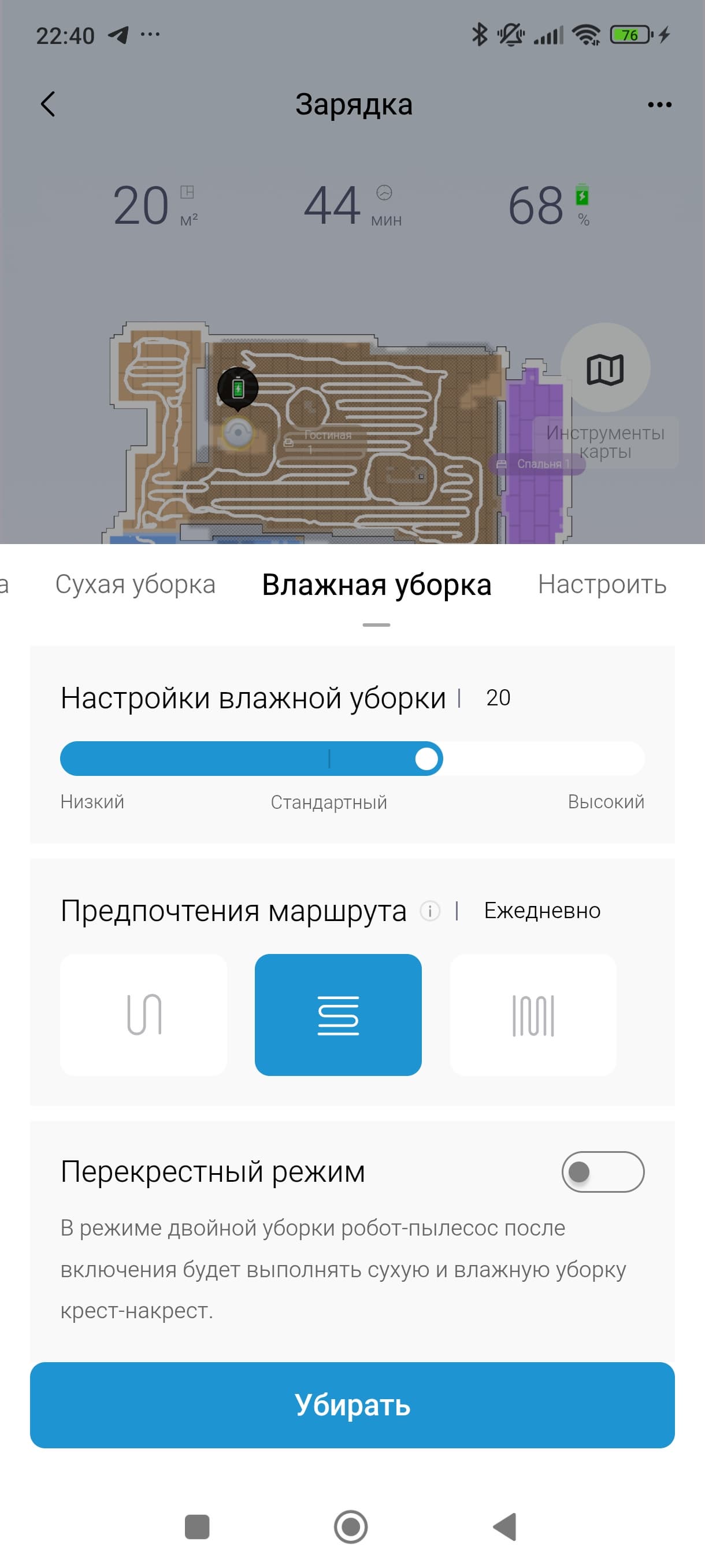 Настроек, касающихся непосредственно уборки, тут довольно много. Пользователь может не только выбрать желаемый режим уборки, мощность всасывания, а также частоту возвращения робота на базу для мытья швабр, но и воспользоваться одним из готовых сценариев — например, «сухая, а затем влажная уборка». Также нам доступны три опции построения маршрута — для быстрой, ежедневной или тщательной уборки. Доступен и перекрестный режим, в котором помещение по сути будет убрано дважды — вдоль и поперек.