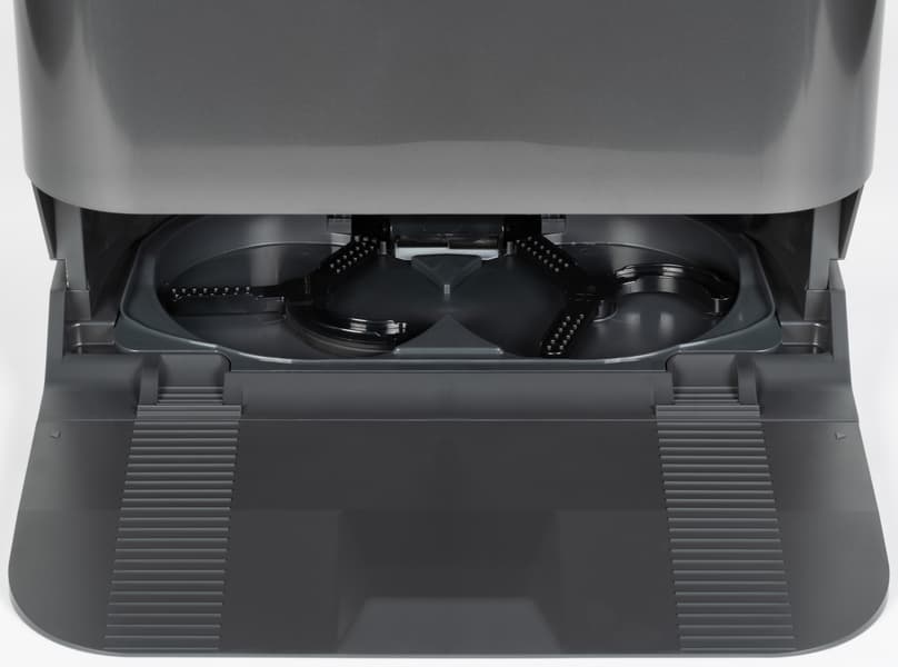 Также в нише, в которой паркуется пылесос, по центру мы видим отверстие для сброса мусора. По бокам от него — подпружиненные контакты для зарядки. Между ними — разъем для дозаправки чистой водой.
