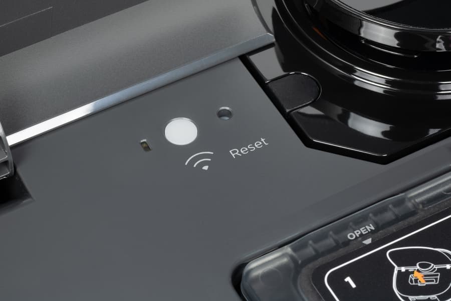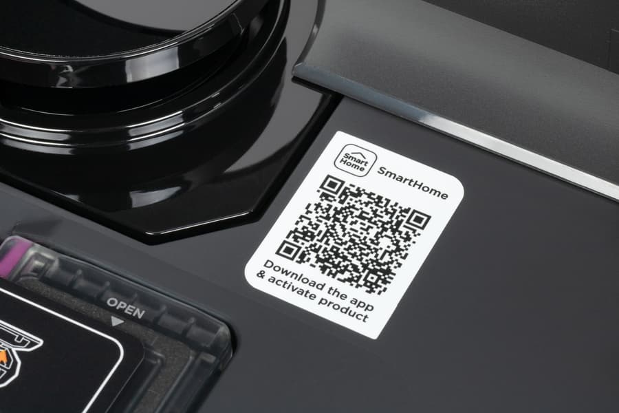 Под верхней откидной панелью находится серийный номер устройства и QR-код для установки фирменного приложения SmartHome. Рядом находится индикатор подключения к Wi-Fi и утопленная кнопка сброса настроек.