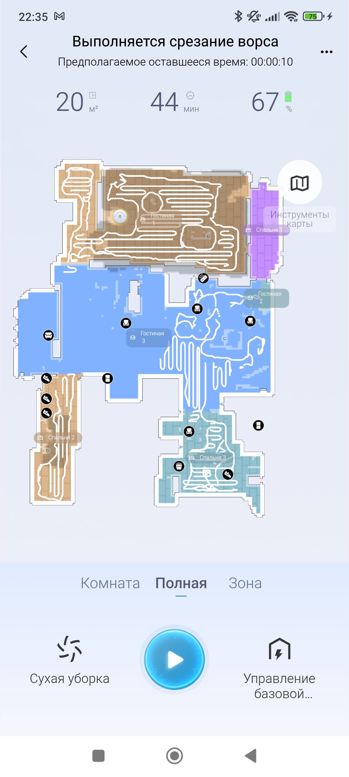 Мы представляем результаты тестирования устройства по нашей методике, подробно описанной в отдельной статье. Перед началом тестов мы позволили пылесосу несколько минут погулять по полигону, чтобы ознакомиться с планом помещения и конфигурацией препятствий, после чего запустили тестовую уборку.