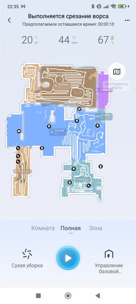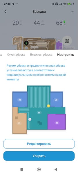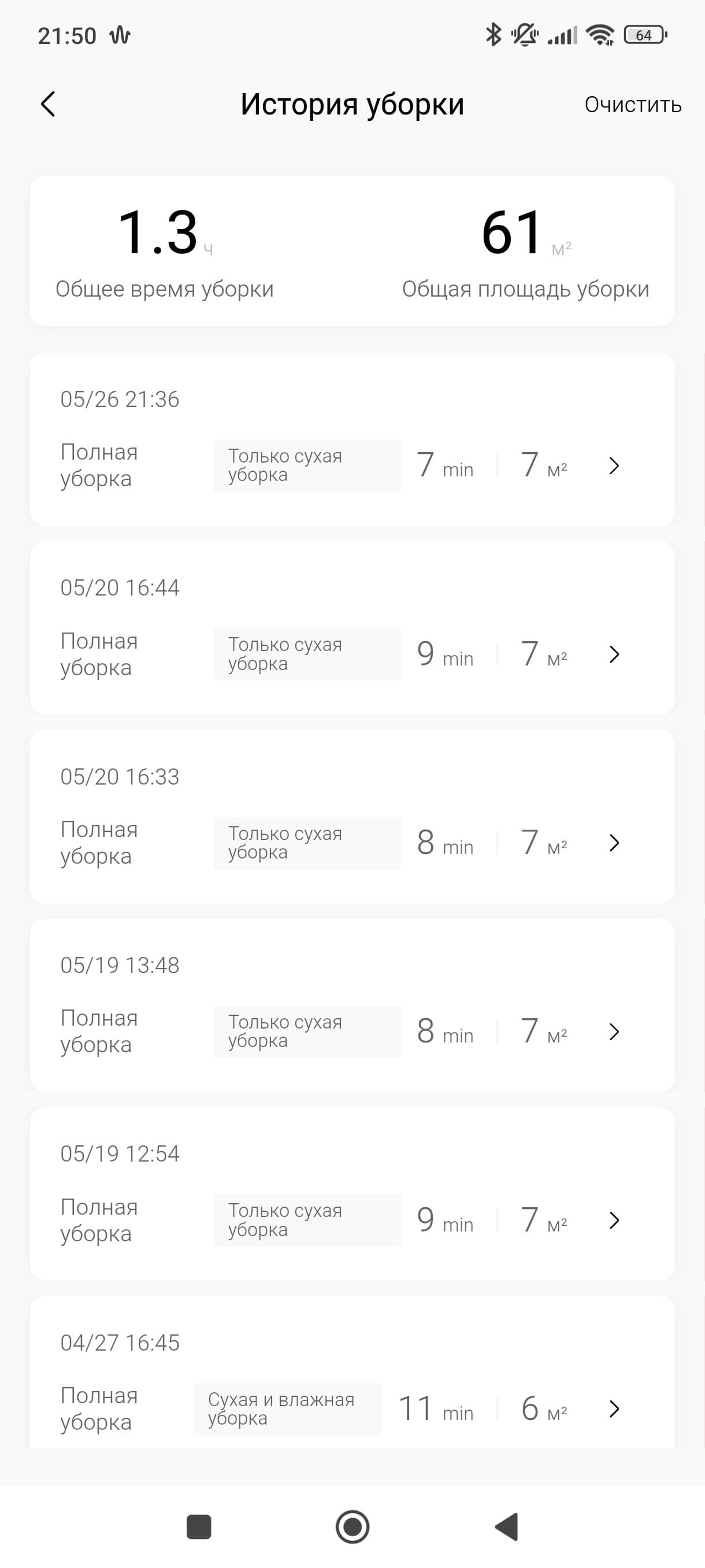 В верхней части находится информация о последней уборке (убранная площадь, время уборки и заряд батареи).
