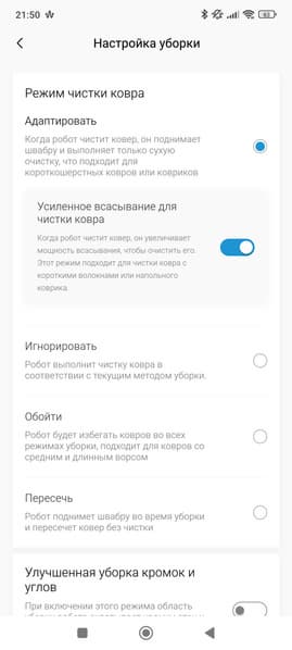 В зависимости от уровня загрязнения помещения мы можем указать, насколько тщательно нужно убирать. Режим «Быстро» не акцентирует внимание на уборке вдоль стен. Программа «Ежедневная уборка», напротив, укажет роботу, что следует внимательно пройти вдоль стен и предметов мебели. Ну а режим «Тщательно» приведет к тому, что робот будет строить маршрут чуть плотнее, что приведет к более качественной уборке всего помещения.