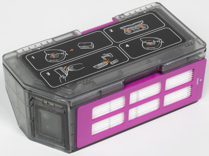 Вернувшись на станцию после уборки, пылесос встает на консоль, совмещая пластины на корпусе с подпружиненными контактами, а входное и выходное отверстия — с соответствующими на базе. После этого включается стационарный пылесос, продувающий мусоросборник насквозь и удаляющий из него пыль и мусор в одноразовый пакет. Когда мешок заполнится, владельцу остается выбросить его и заменить новым.