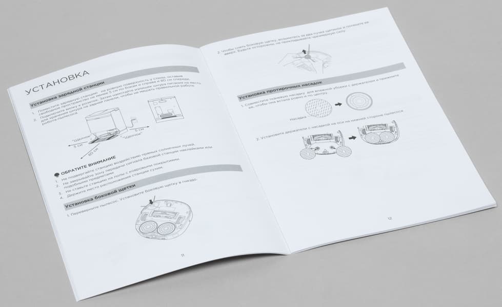 Комплектные боковые щетки нужно установить на место до щелчка, а внутрь базы вложить мешок для мусора (если его там по какой-то причине не оказалось). Перед включением устройство следует полностью зарядить. Продолжительность первой зарядки может быть дольше стандартной, поэтому мы, как водится, просто оставили робота на базе на ночь.