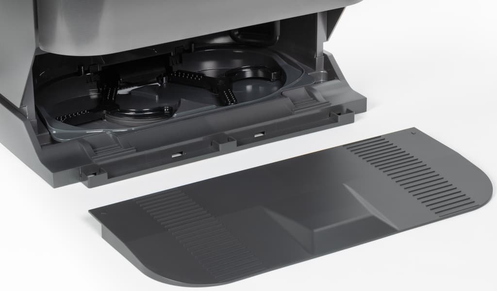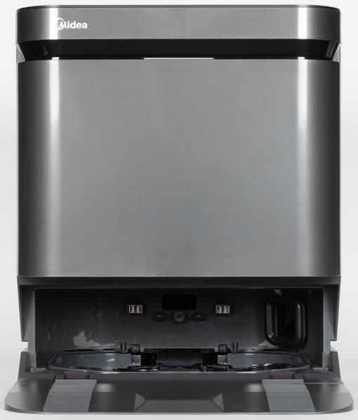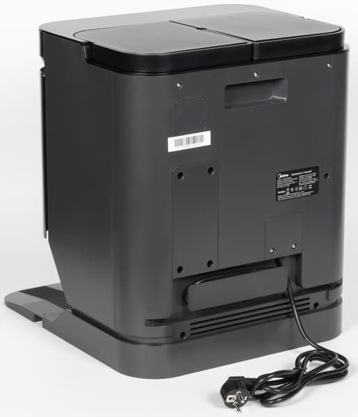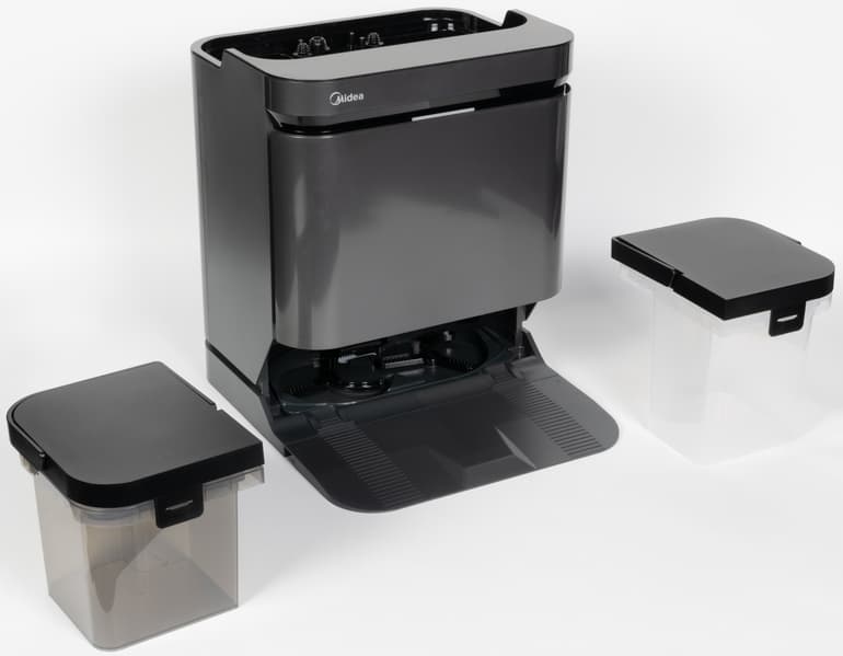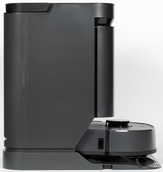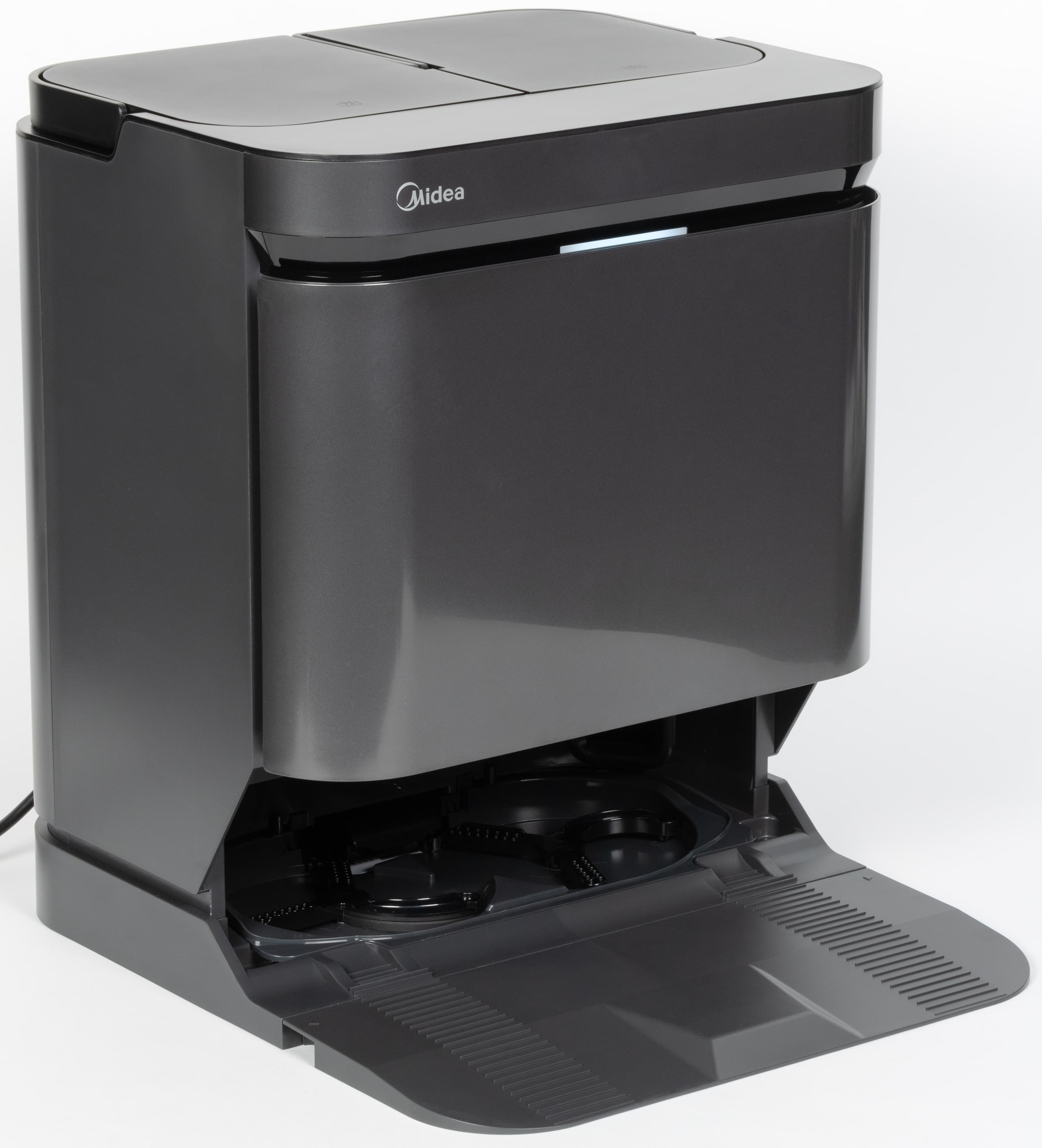 Теперь взглянем на базовую станцию. В целом она выглядит почти стандартно для топовых моделей с автоматизированной влажной уборкой. Материал — пластик. Цвет — графитовый.