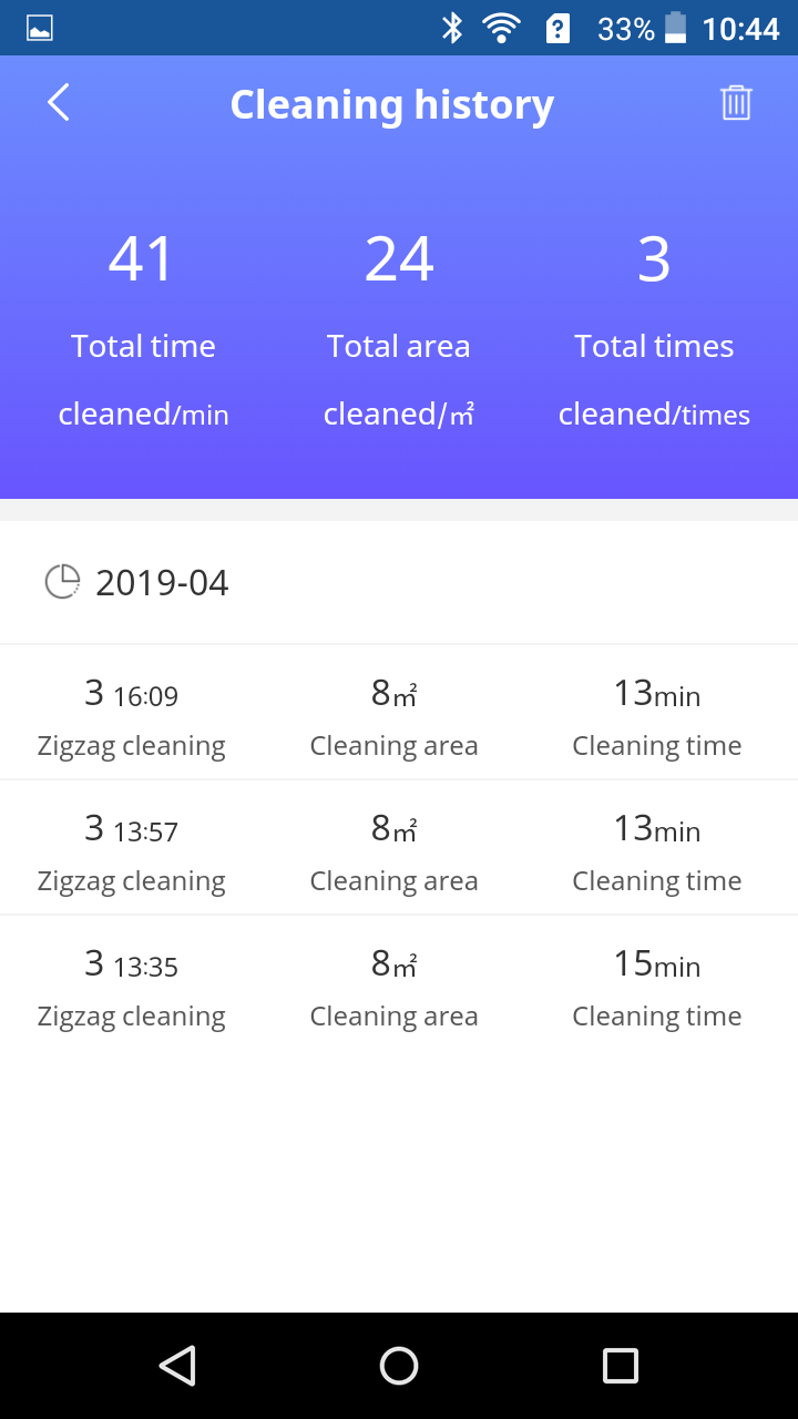 В «розовой» комнате площадью 10 м² робот потерял ориентацию (длинная горизонтальная линия на карте), но продолжил уборку. Возможно, потеря ориентации была неоднократной. В итоге, посчитав на 45-й минуте, что убирать хватит, робот не смог найти базу там, где ожидал, и возвращался на базу 10 минут, двигаясь по стеночке.