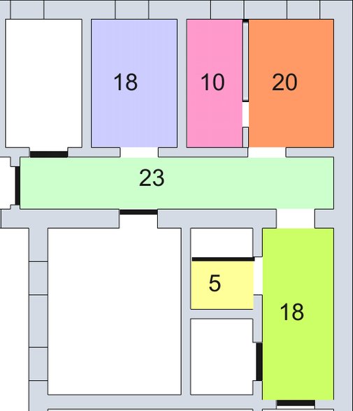Дополнительно были проведены натурные испытания. Для этого в офисном и относительно чистом помещении был выгорожен участок из нескольких комнат общей площадью примерно 94 м². В коридоре (23 м²) только шкаф в торце, в других помещениях заполнение мебелью среднее, людей нет. Схема помещения приведена ниже. На ней цветными прямоугольниками отмечены доступные роботу комнаты. База робота установлена на схеме внизу справа.