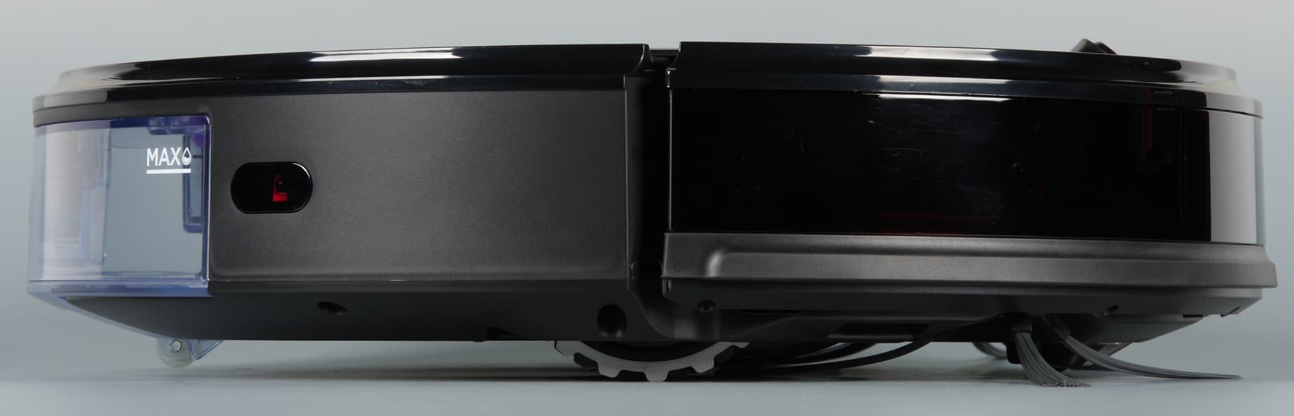 Края сзади снизу скошены, что помогает роботу преодолевать препятствия, а выраженная угловатость при переходе от верхней панели к боковой поверхности снижает вероятность того, что пылесос будет застревать под препятствиями с небольшим просветом.