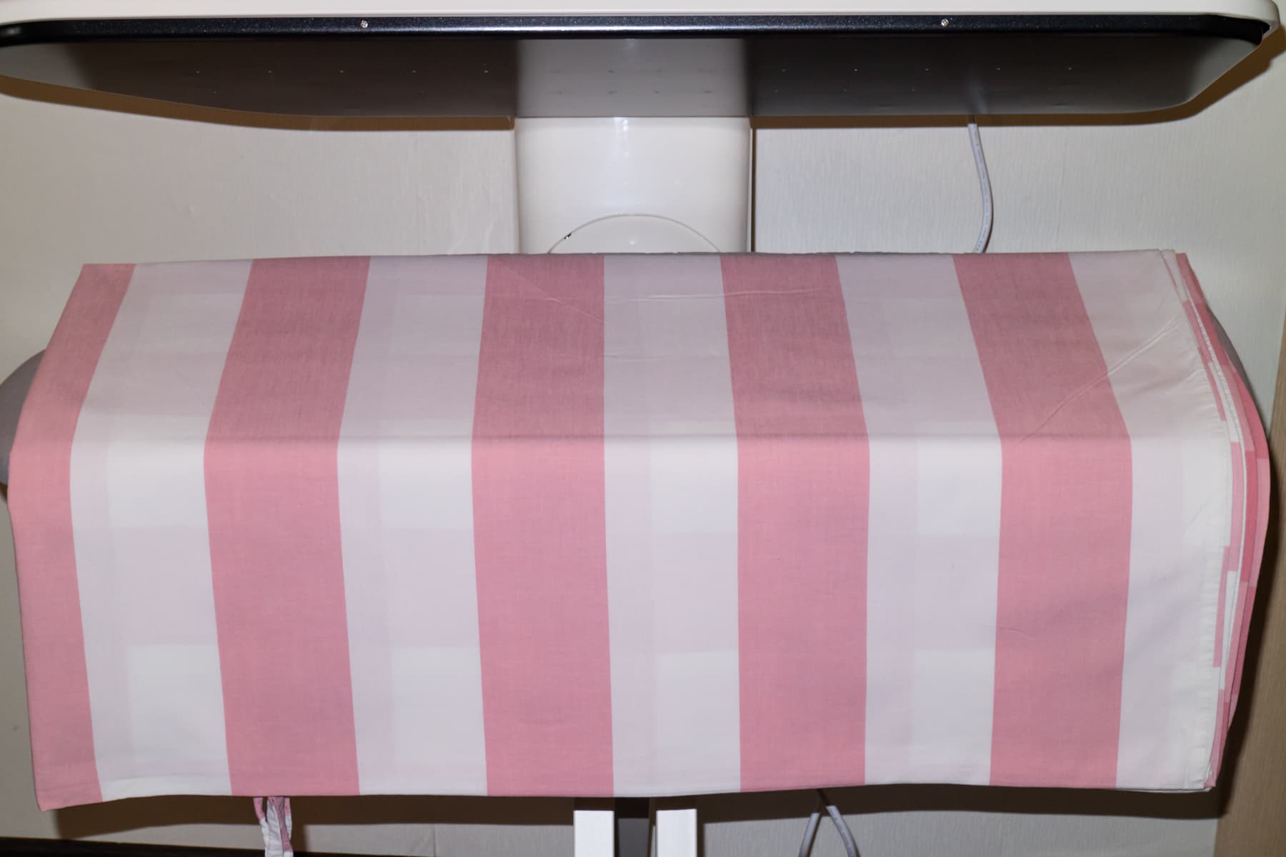 Наибольшие затруднения у нас возникли при глажении простыни на резинке. По периметру, где натянута резинка, располагали простынь на гладильной доске в один слой. А вот прямые фрагменты можно было обрабатывать в несколько слоев.