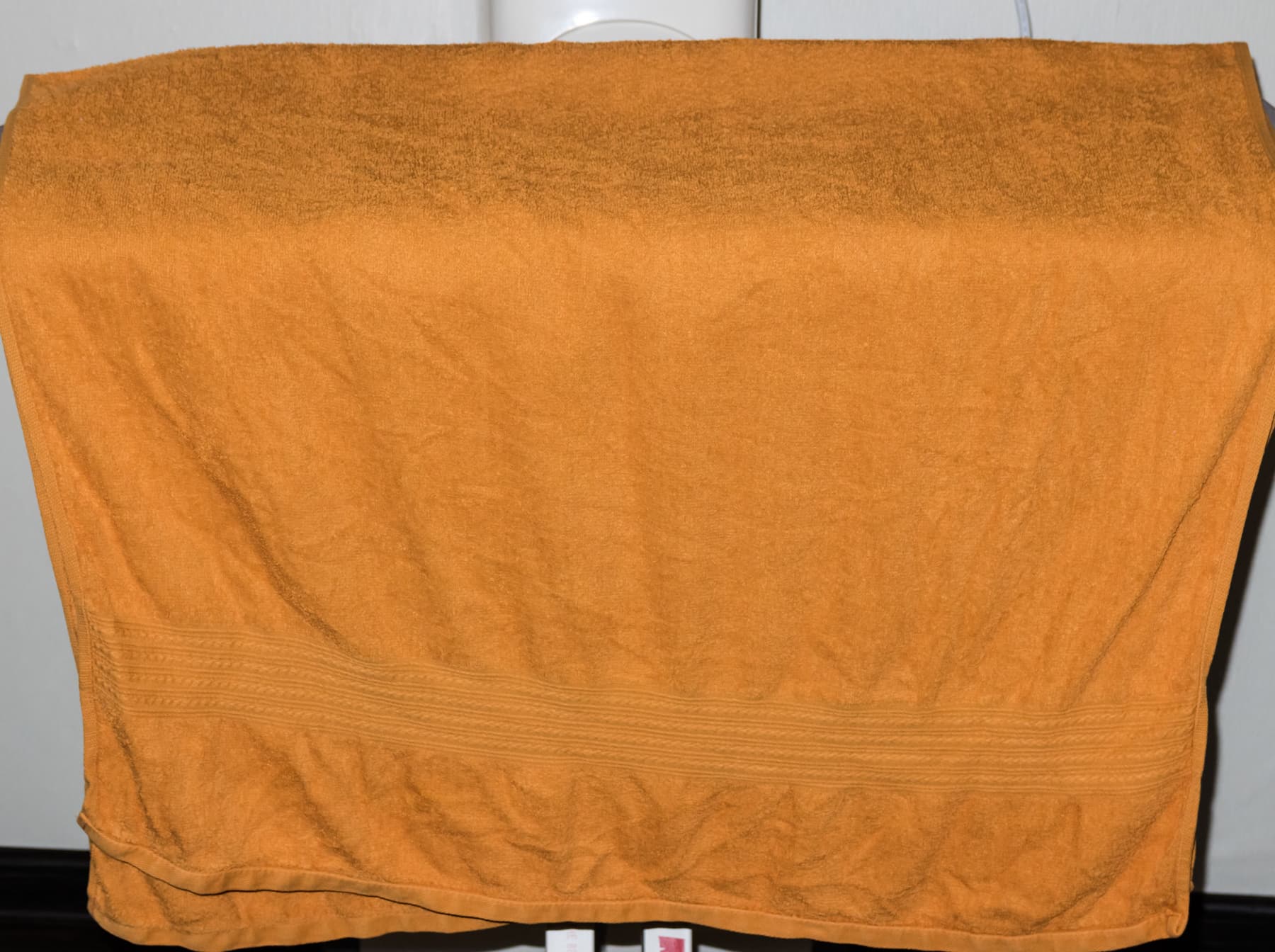 Затем скатали полотенце в неширокий валик и разместили за гладильной поверхностью так, чтобы после обработки ткани вытягивать отглаженный фрагмент на себя, тем самым на доске размещается новый мятый отрезок. Полотенце было приведено в хороший вид за три соприкосновения с гладильным прессом. Обработку производили в режиме Cotton при верхней подаче пара.