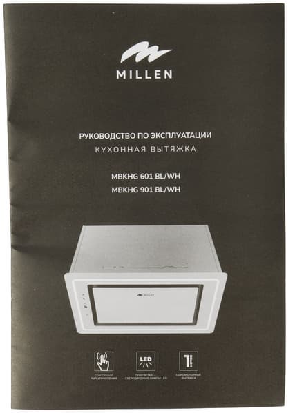 Вытяжка Millen MBKHG 901 BL упакована в коробку из коричневого картона с одноцветной печатью. На передней стороне производитель разместил векторное изображение прибора и перечислил основные его особенности. Это сенсорное управление, светодиодная подсветка, одномоторная конструкция и ширина 90 сантиметров.