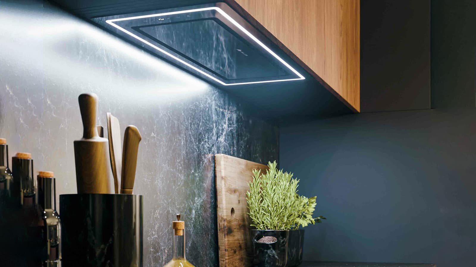 Вытяжка подразумевает полноценное встраивание в кухонный гарнитур: после установки пользователю видна только нижняя панель, сделанная из темного закаленного стекла. По всему периметру проходит скрытая за белым стеклом светодиодная лента, подсвечивающая рабочую зону.