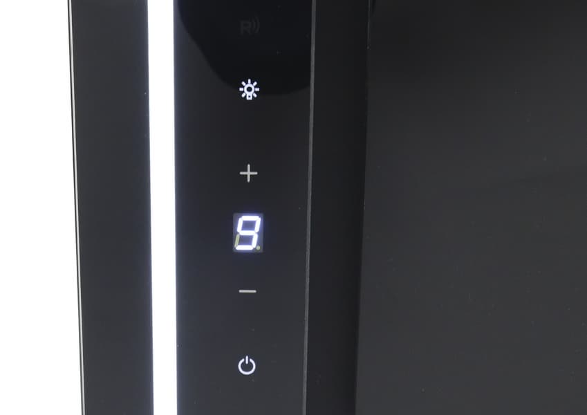 В левой части вытяжки размещается сенсорная панель с семисегментным цифровым светодиодным индикатором, отображающим скорость вращения вентилятора. Подробнее управление прибором мы рассмотрим чуть ниже, в соответствующем разделе.