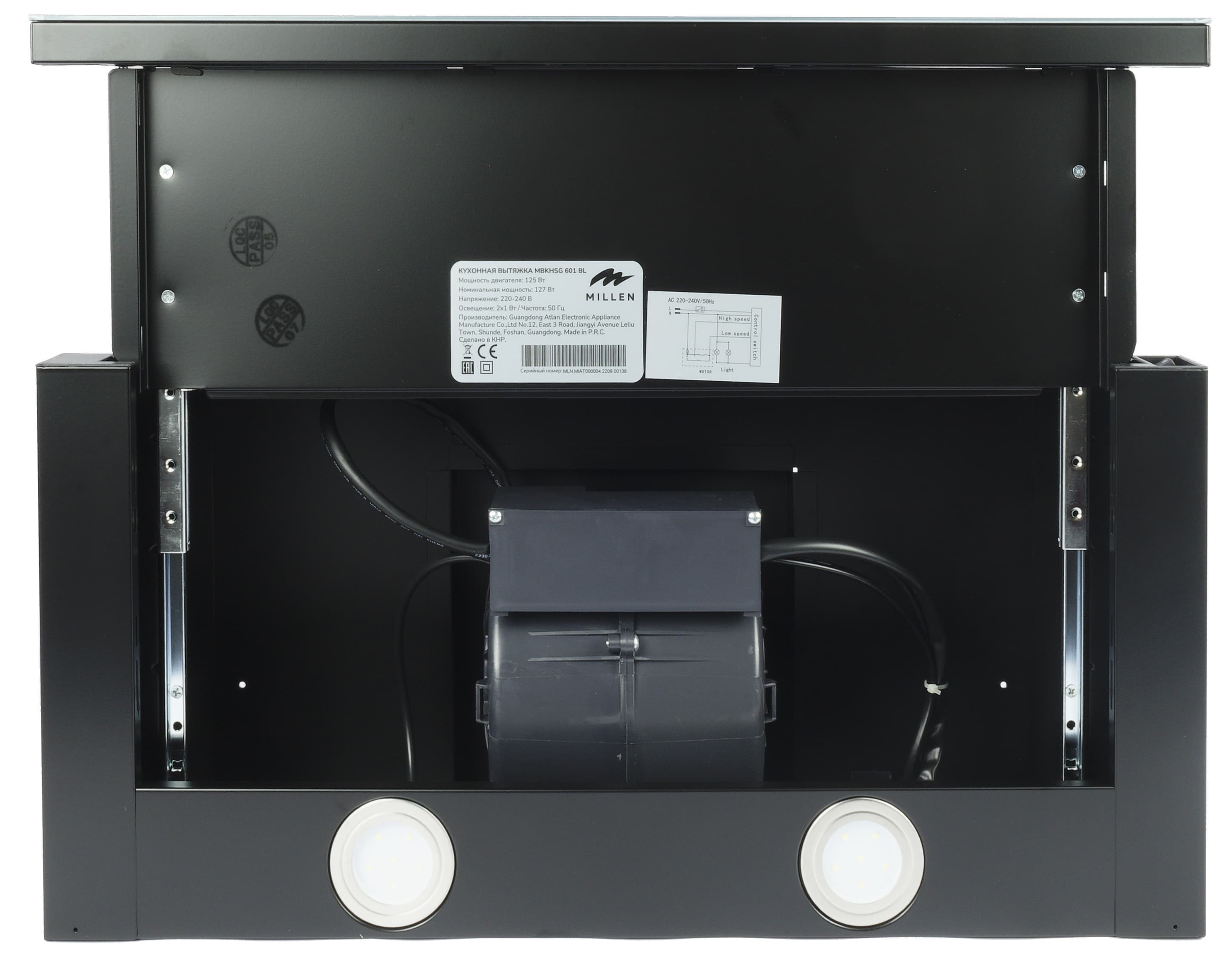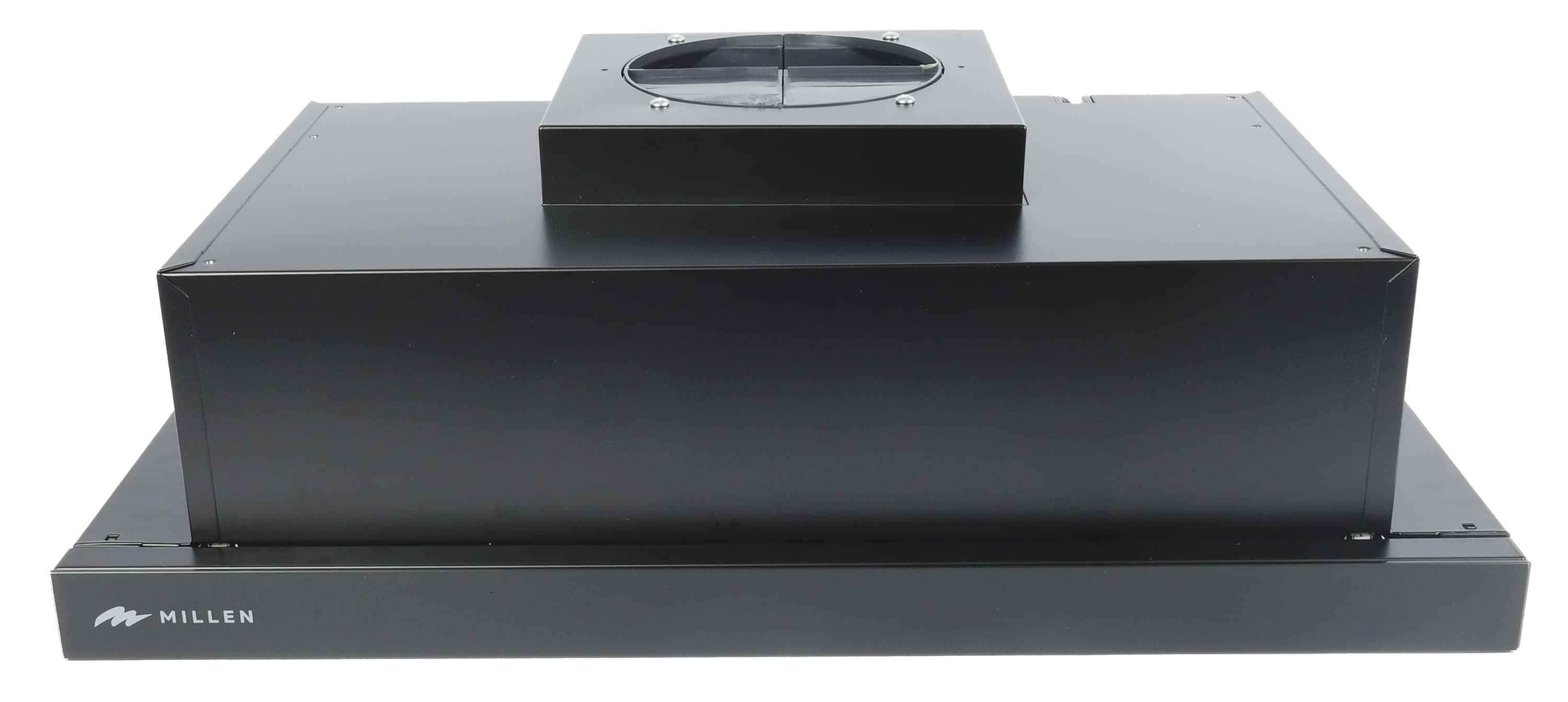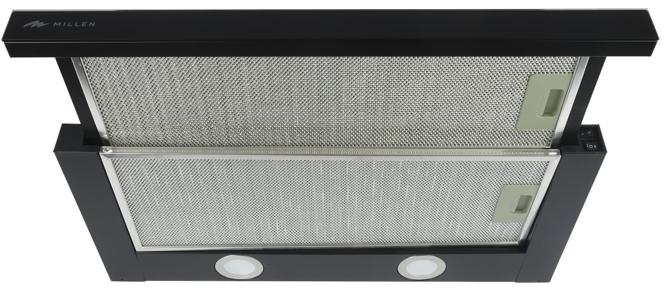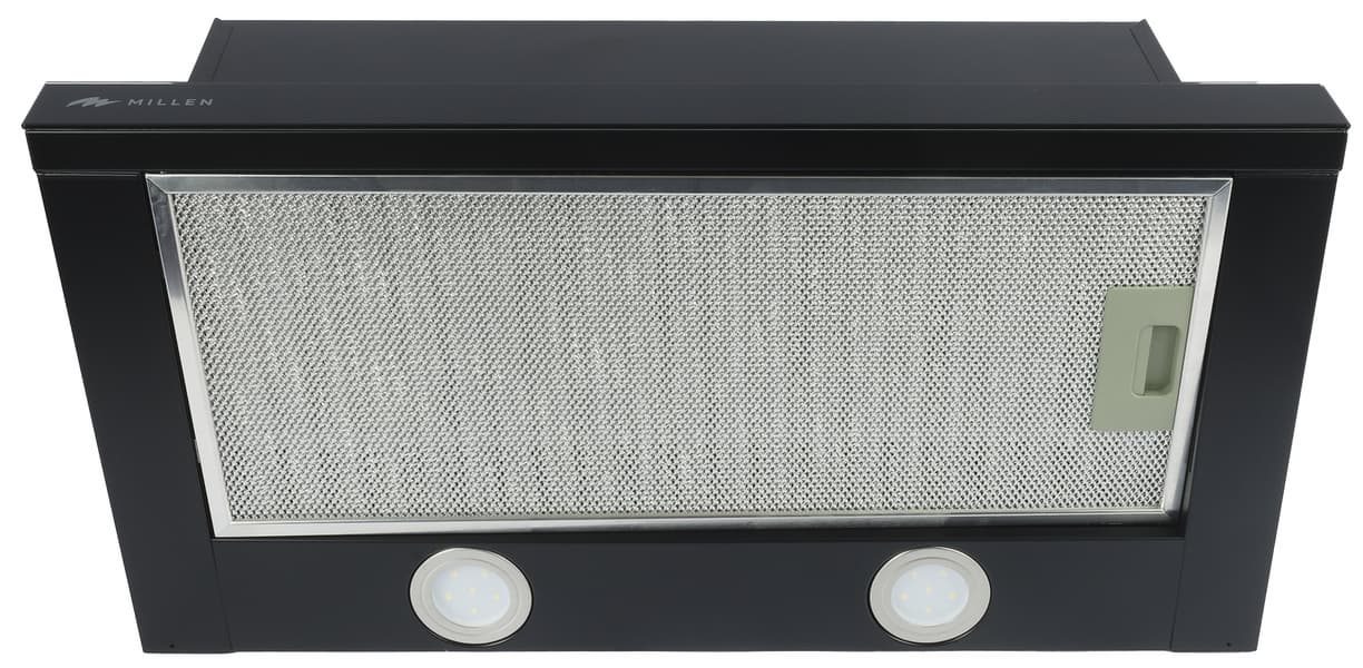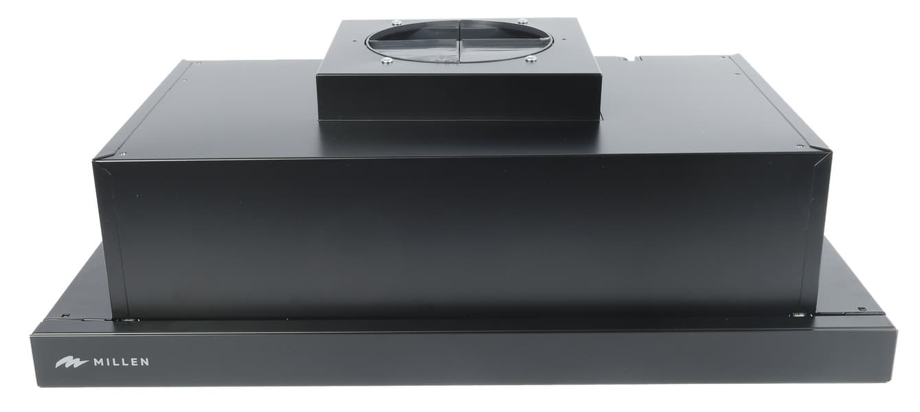 Подавляющее большинство телескопических кухонных вытяжек похожи друг на друга, и Millen MBKHSG 601 BL — не исключение. Сходные решения мы видели у устройств Candy, Lex и Hebermann. Корпус этих моделей подразумевает полное встраивание: к пользователю обращены только торец выдвижной панели, отделанной стеклом черного цвета, и нижняя плоскость. Все остальные детали окрашены черной эмалью и после установки скрываются за элементами кухонного гарнитура.