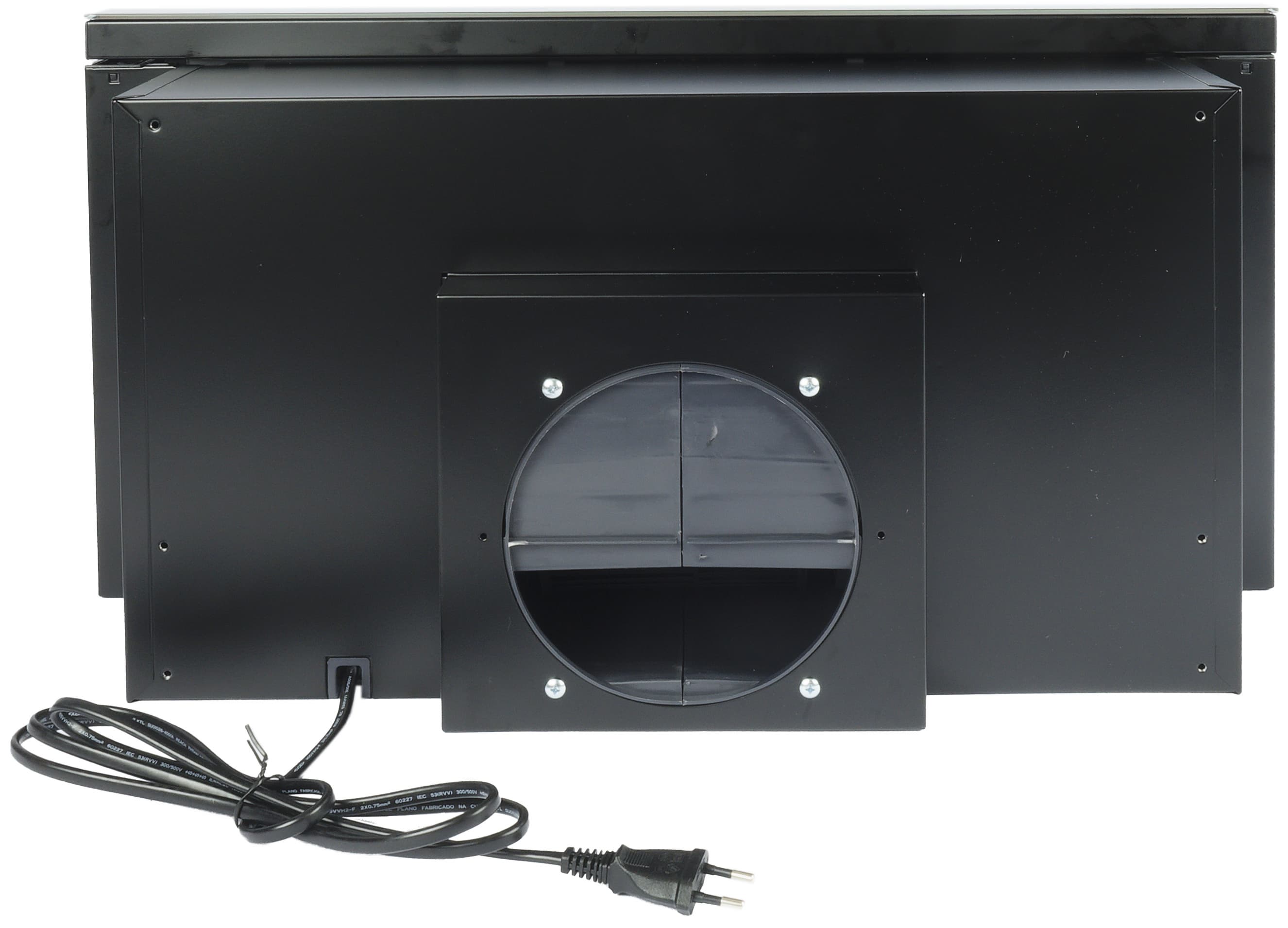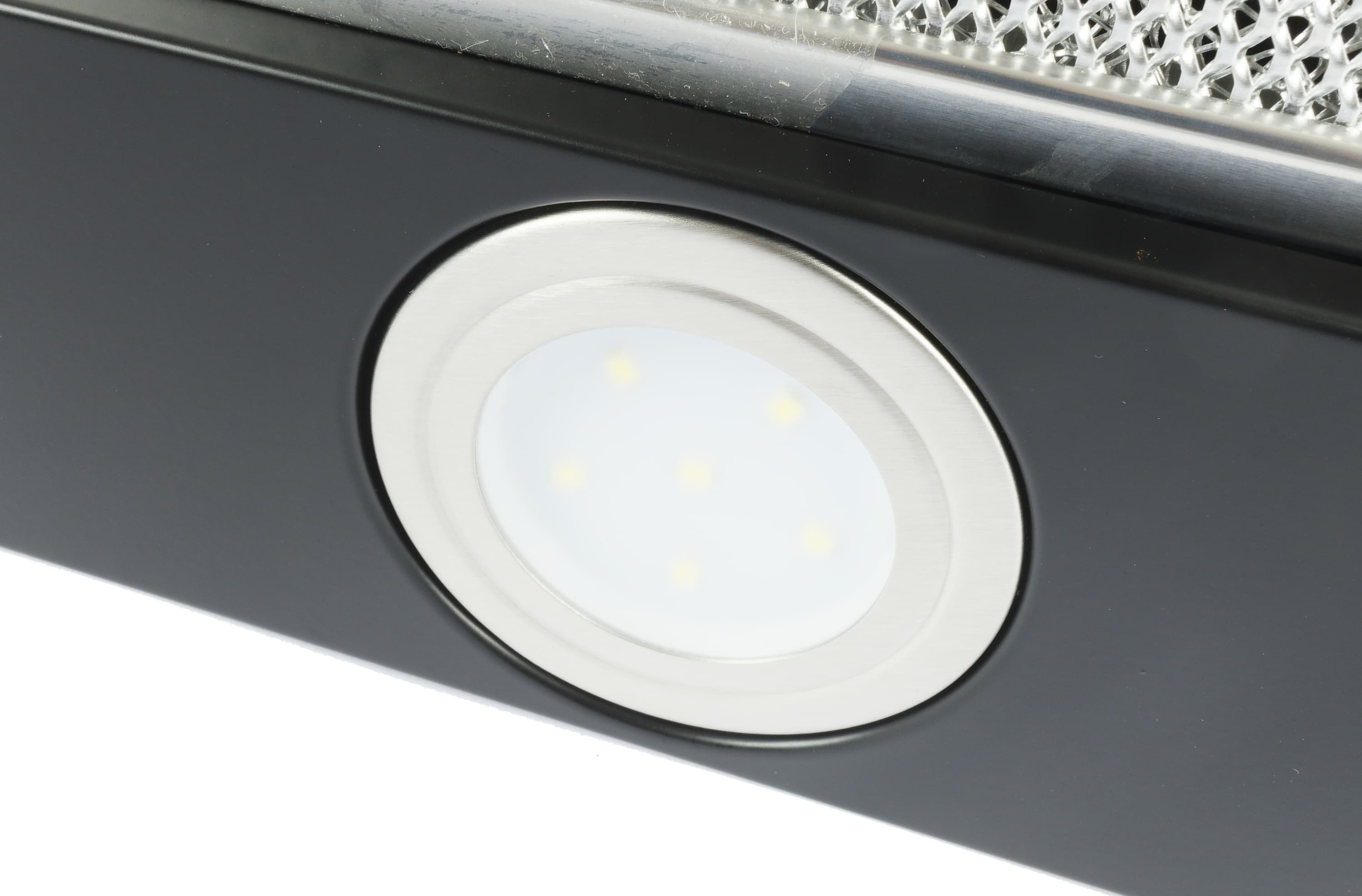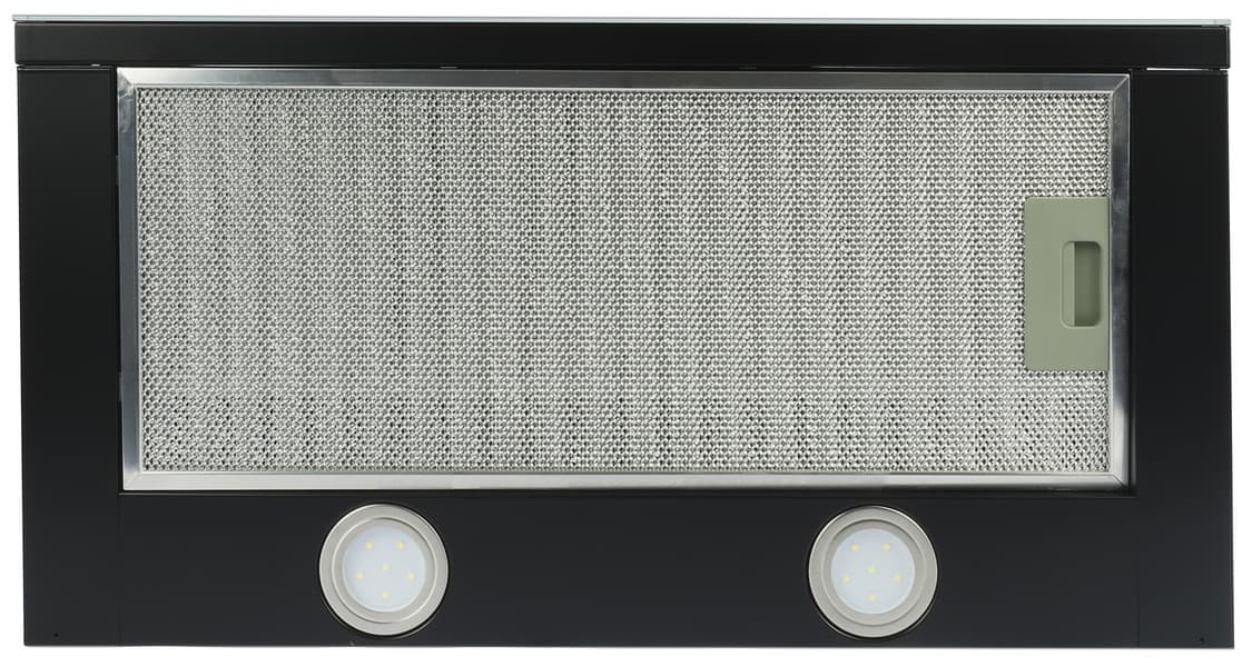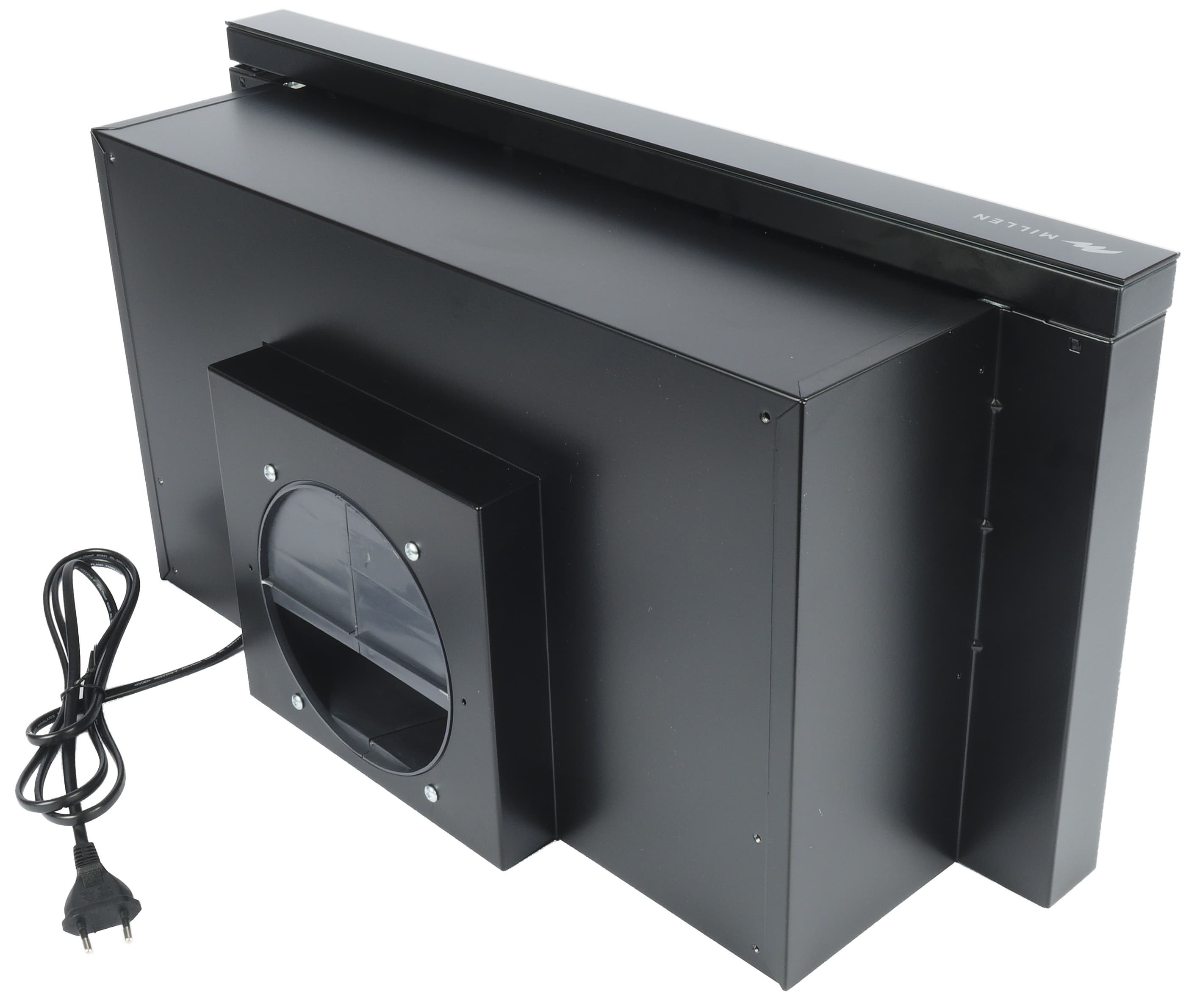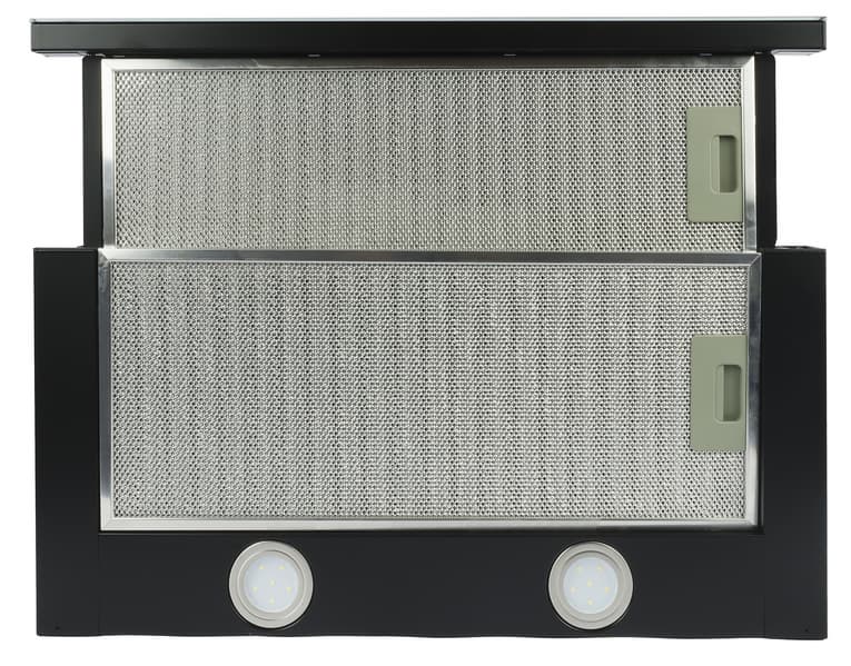 Подавляющее большинство телескопических кухонных вытяжек похожи друг на друга, и Millen MBKHSG 601 BL — не исключение. Сходные решения мы видели у устройств Candy, Lex и Hebermann. Корпус этих моделей подразумевает полное встраивание: к пользователю обращены только торец выдвижной панели, отделанной стеклом черного цвета, и нижняя плоскость. Все остальные детали окрашены черной эмалью и после установки скрываются за элементами кухонного гарнитура.