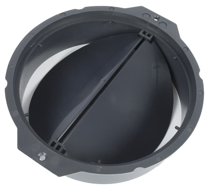 Пластиковая конструкция диаметром 120 мм снабжена двумя лепестками, препятствующими попаданию внутрь устройства пыли и загрязненного воздуха из вентиляционных труб. Клапан закрепляется на корпусе с помощью двух приложенных винтов.