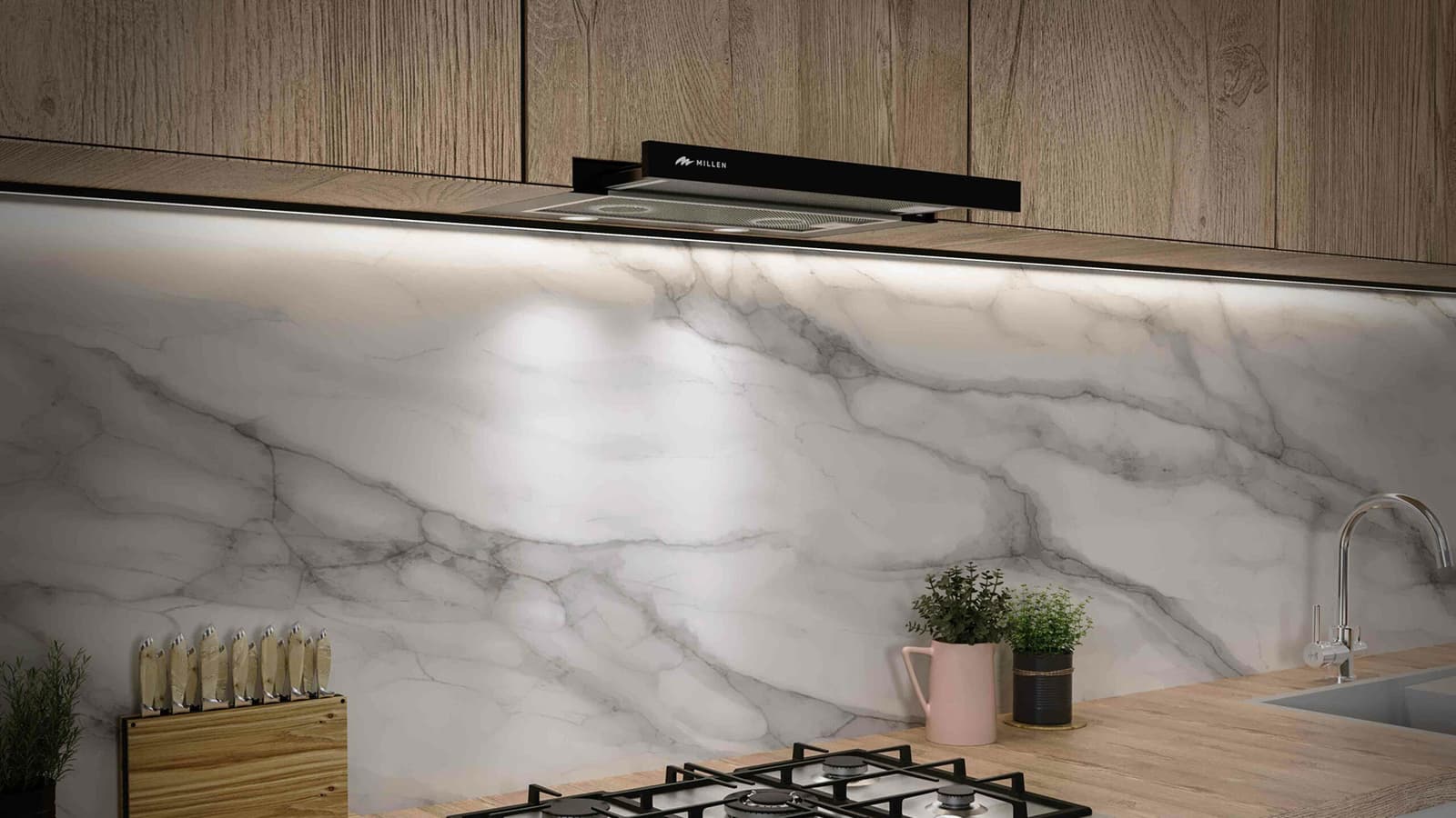 Чем хороши телескопические вытяжки? Пока такая модель не работает, она занимает не так много места, но пока не выдвинешь панель, воздух над плитой очищаться не начнет. Так что если вы устали биться лбом о большую вытяжку (например, при мытье плиты), подумайте, не поменять ли ее на телескопическую. Например, на Millen MBKHSG 601 BL.