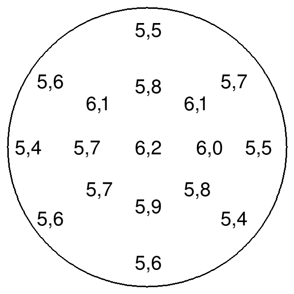 Исходя из полученной средней скорости вычисляется производительность вытяжки в кубометрах воздуха в минуту. Для этой модели результаты измерений выглядели следующим образом (цифры — скорость в метрах в секунду).