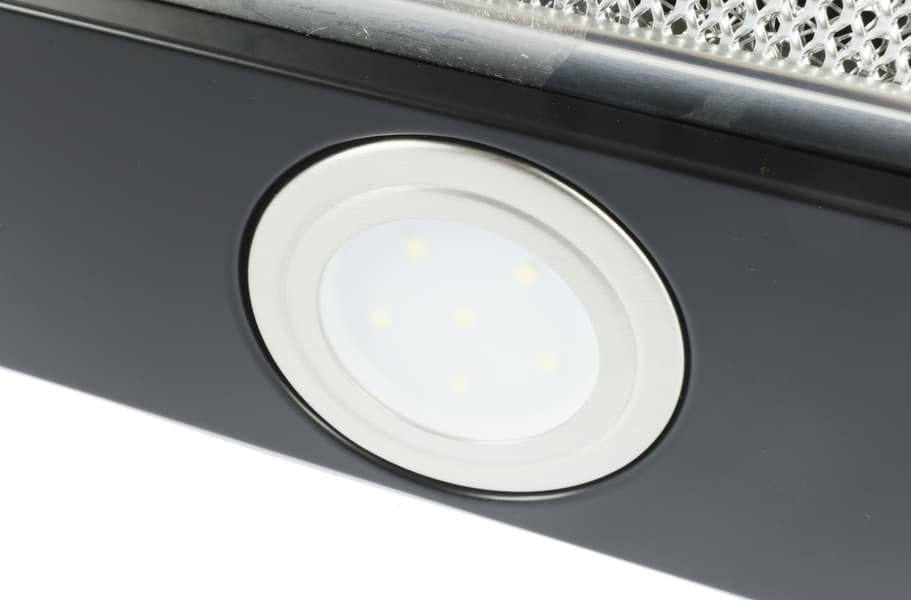 Использованные в конструкции лампы подсветки обладают хорошей яркостью. Их белый холодный свет позволяет вытяжке при необходимости выполнять роль единственного источника освещения на кухне.