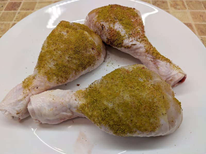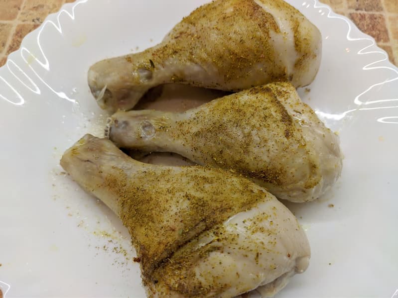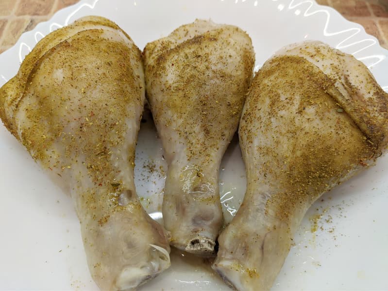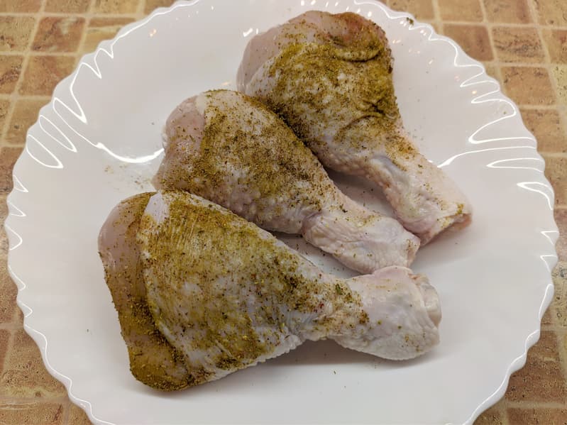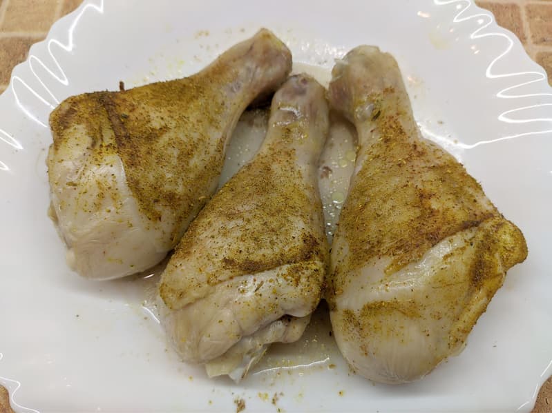 Автоматическая программа для приготовления мяса (А4) позволяет готовить за один раз 250, 350 или 450 г продукта. Для этого теста мы взяли куриные голени — ровно 450 г. Присыпали их смесью соли и специй и запустили программу на 6 минут 30 секунд.