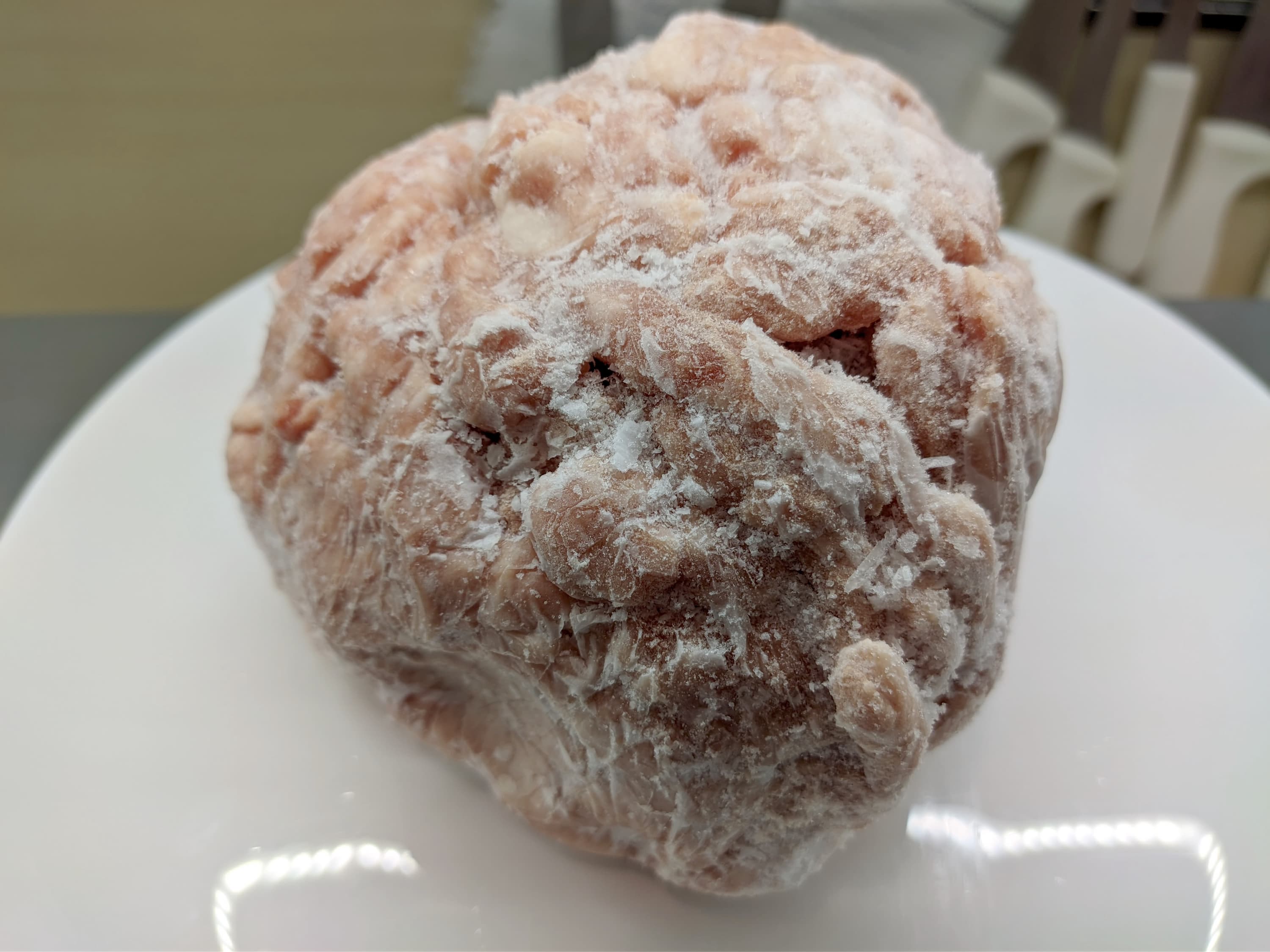 Сняв разморозившуюся часть, мы обнаружили, что внутри остался плотный мясной «колобок», вес которого составил примерно 40% от исходного веса фарша. Его придется размораживать дополнительно.