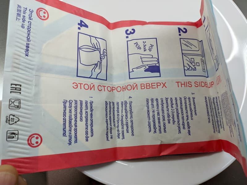 На приготовление пачки попкорна, согласно инструкции, требуется 2-3 минуты (в зависимости от мощности микроволновки). Мы установили максимальную мощность, вооружились секундомером и стали ждать.