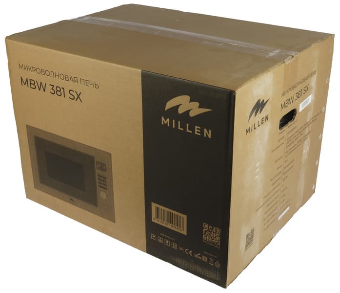 Микроволновая печь приехала к нам в крупной картонной коробке с указанием бренда, модели и краткой технической информации на лицевой стороне. По бокам у коробки вырезаны ручки, а также приведены основные сведения об устройстве и его технические характеристики. На лицевой стороне — название модели, логотип Millen и изображение прибора.