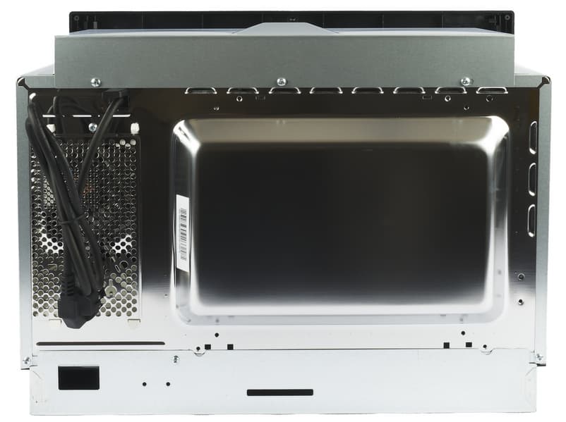 С тыльной стороны мы видим вентиляционные отверстия, выгнутый защитный экран и место крепления шнура. Длина провода составляет 1 метр, вилка уже установлена, так что для подключения микроволновки будет достаточно работающей розетки.