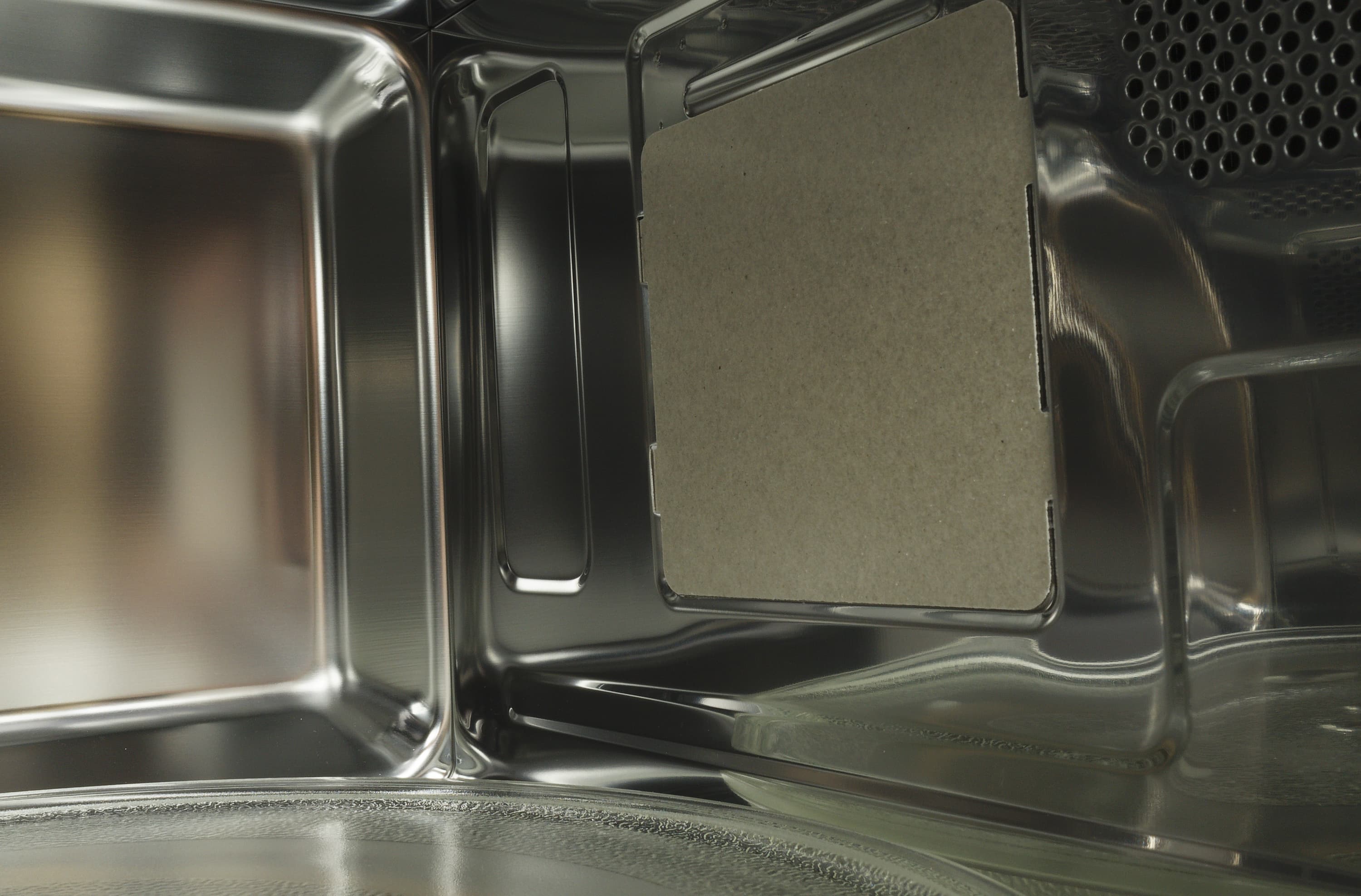 Производитель заявляет, что у нашей микроволновки имеется тройное остекление дверцы. Мы, впрочем, смогли рассмотреть лишь два стекла и классическую решетку-сетку между ними. Видимо, на сайте информация о приборе содержит ошибки (например, там же нам ошибочно сообщают о сенсорном управлении).