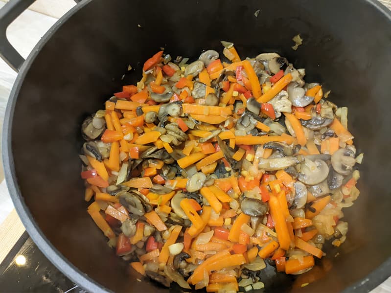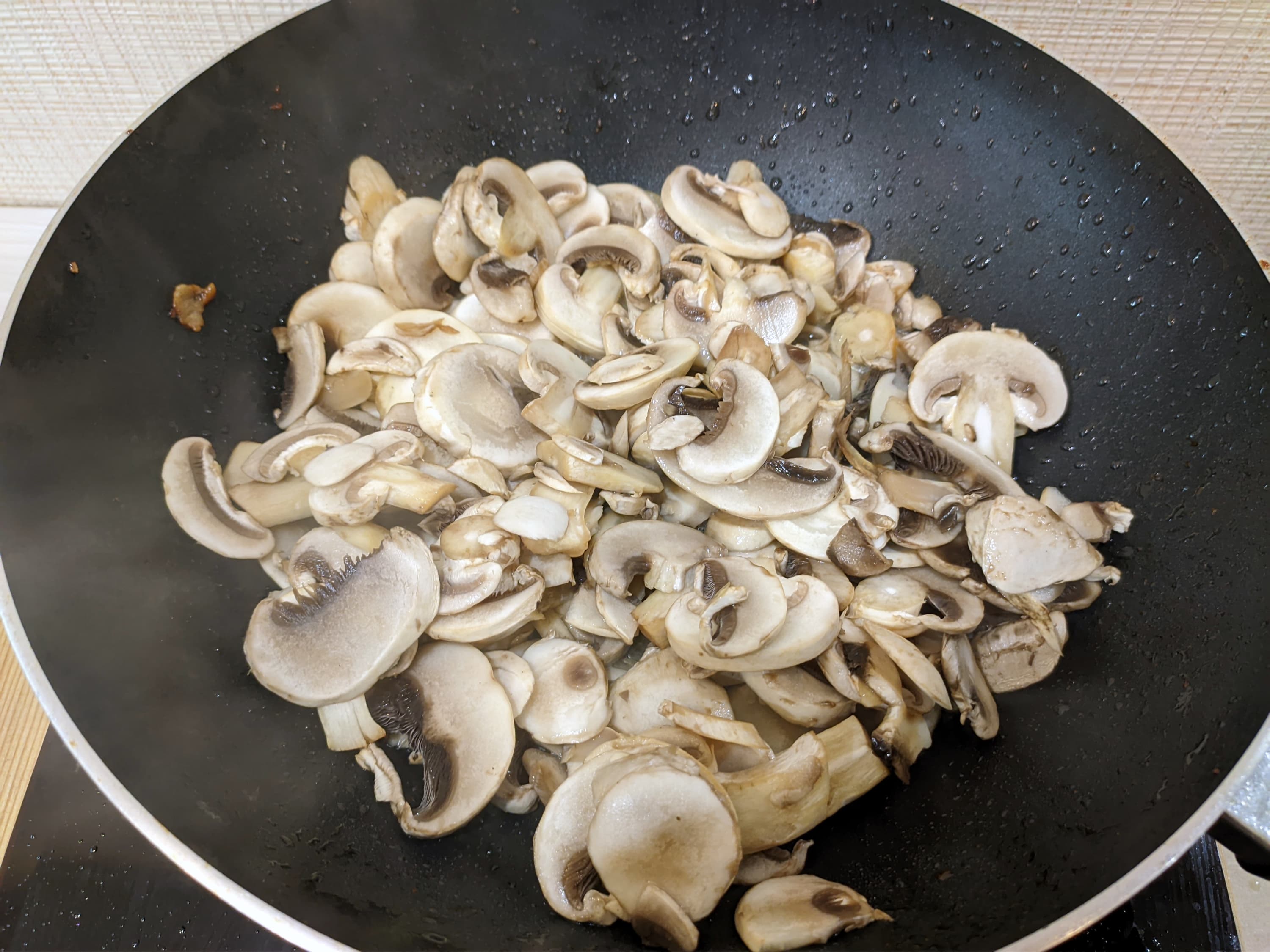 ...а когда всё будет почти готово — вмешиваем туда же предварительно обжаренные грибы.