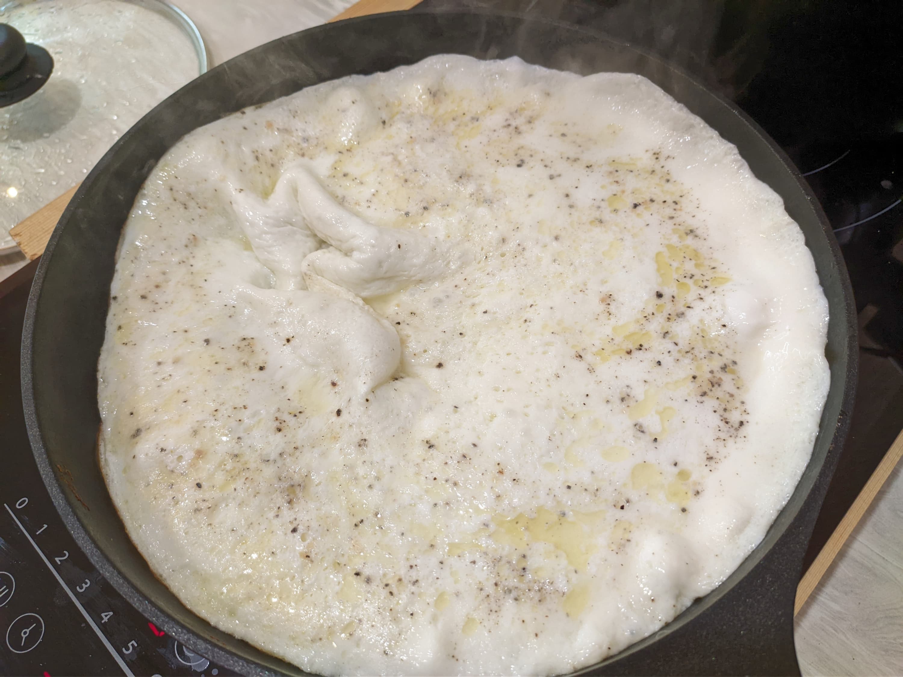 В процессе жарки обнаруживаем, что даже относительно небольшое смещение сковороды относительно центра области нагрева приводит к тому, что одна половина сковороды начинает греться заметно сильнее. На фото это видно по степени румяности корочки.