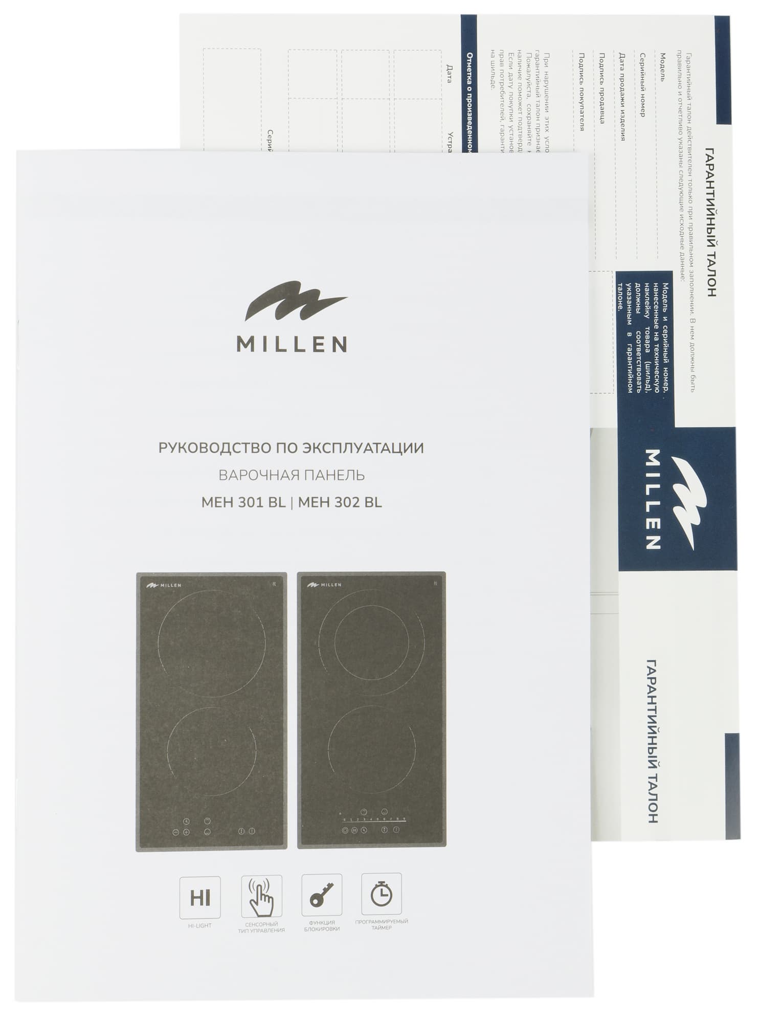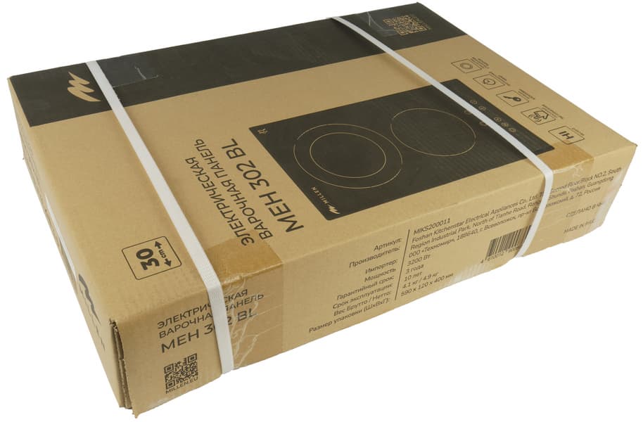 Электрическая варочная панель Millen MEH 302 BL поставляется в большой плоской коробке из прочного картона. На лицевой и обратной сторонах упаковки размещены: изображение устройства, полное название модели, логотип компании, перечислены ключевые особенности и краткие технические характеристики.