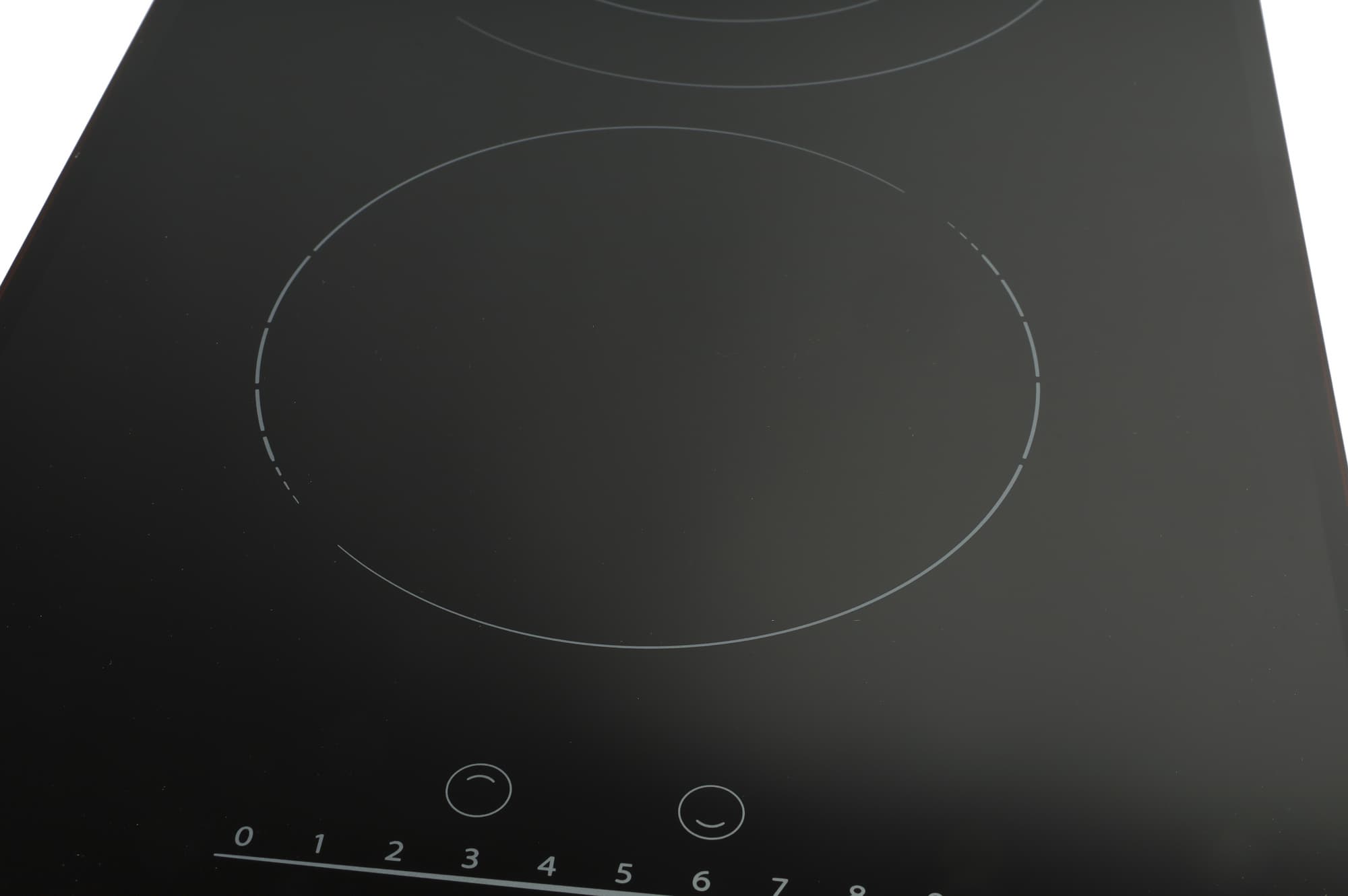 Устройство оснащено двумя конфорками: малая имеет диаметр 165 мм и работает на мощности до 1200 Вт. Большая конфорка двухконтурная. Она позволяет установить зону нагрева на 138 или 200 мм. Мощность при этом составляет до 1000 и 2000 Вт соответственно.